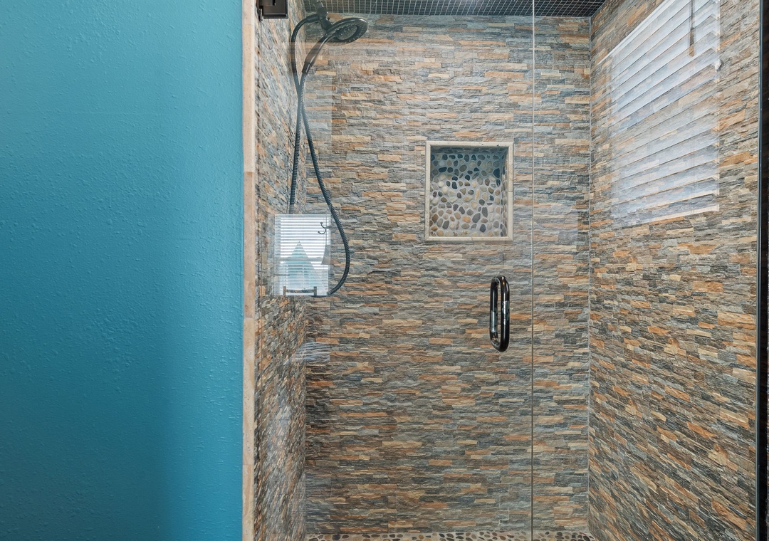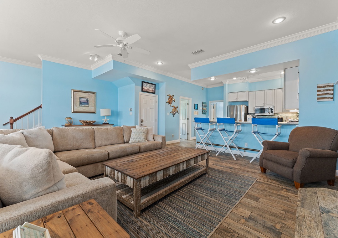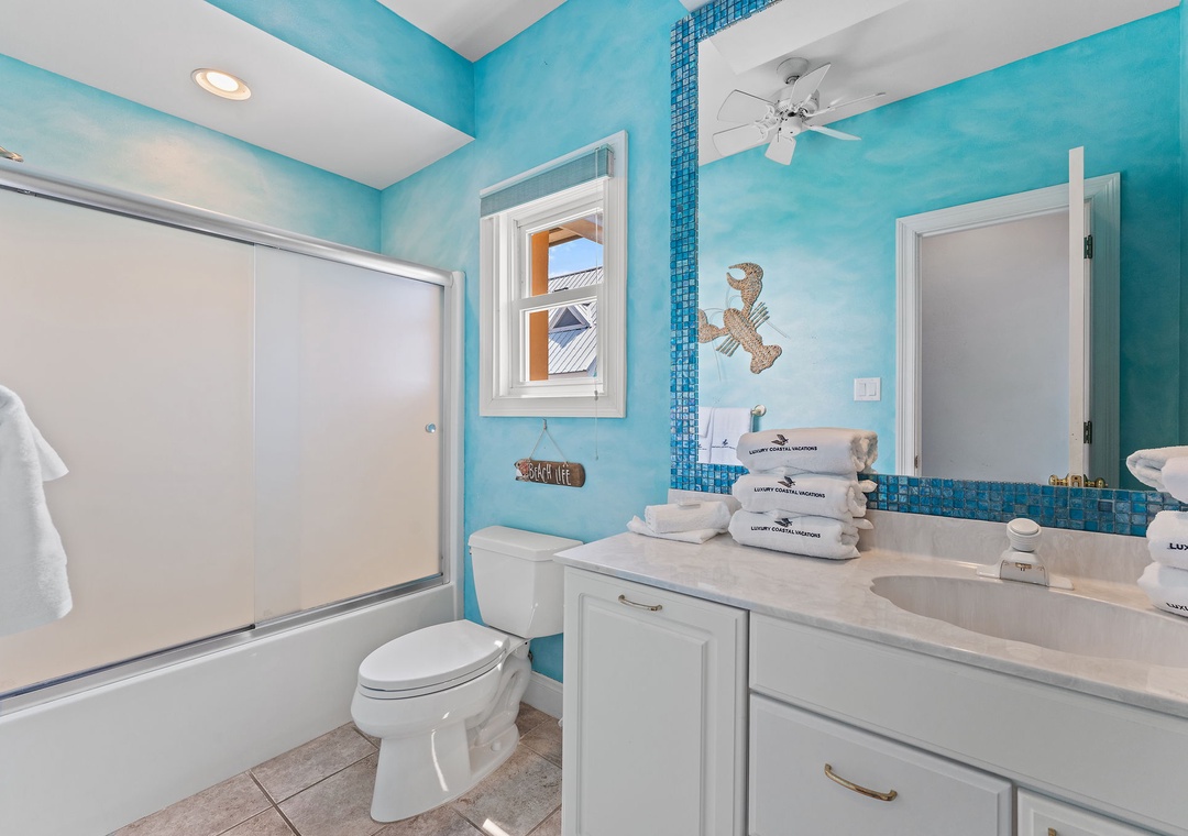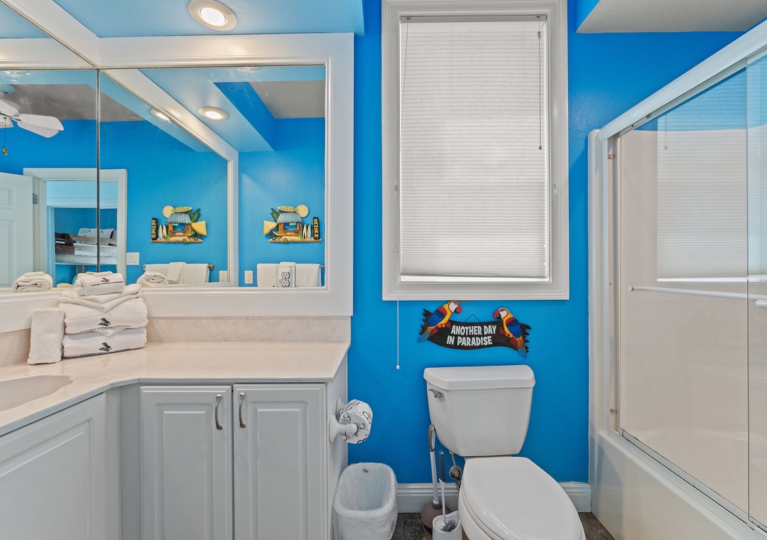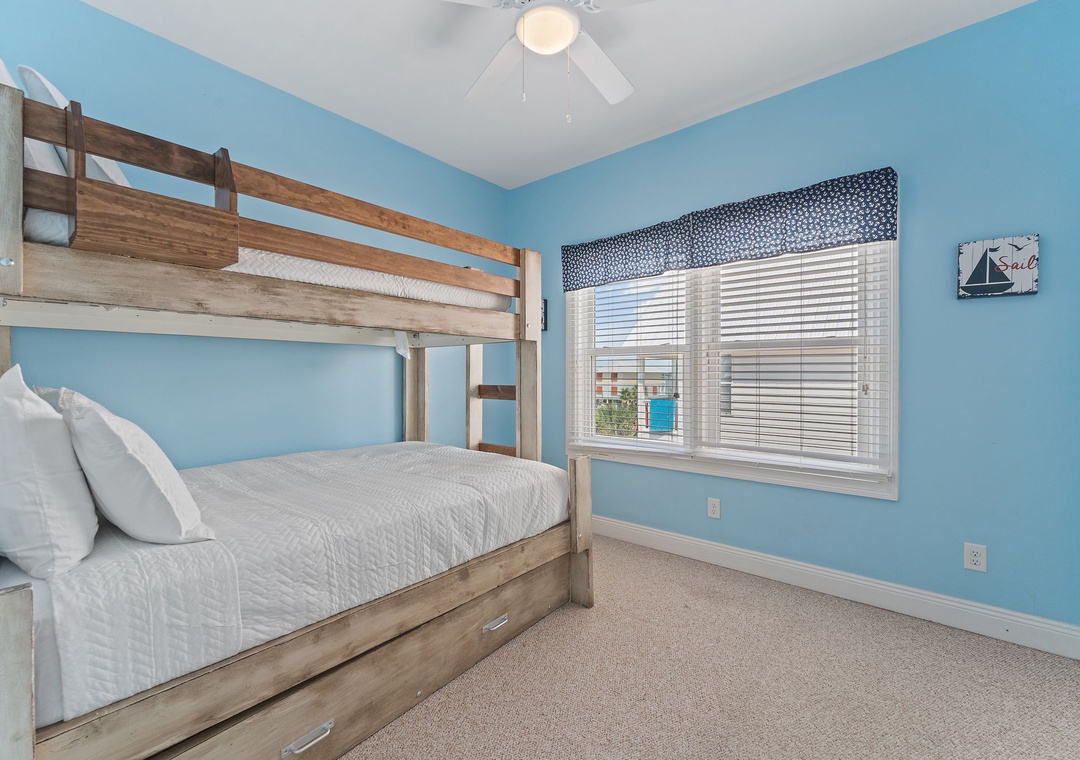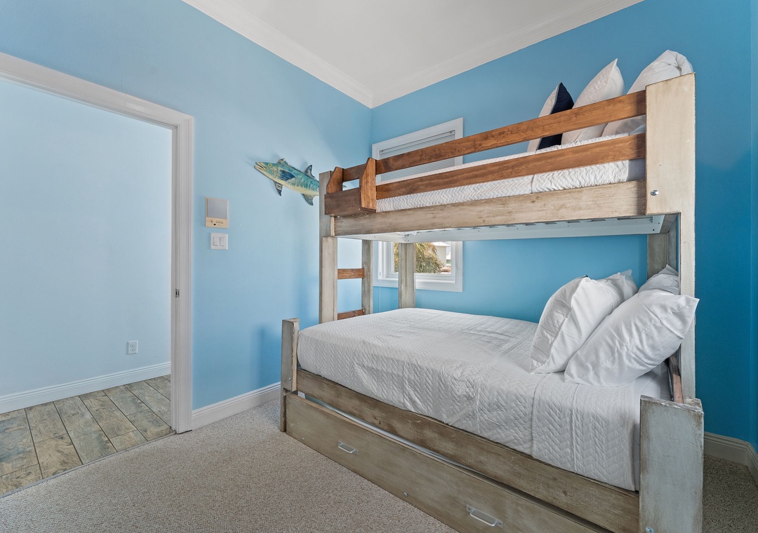 Also located on the upper floor are a charming queen bedroom and a vibrant bedroom adorned with a twin over full bunk bed – a dream come true for the younger members of your party. An additional full bathroom upstairs ensures ample convenience for all. The ground floor boasts a cozy bedroom featuring another twin over full bunk bed and a full bathroom, providing extra comfort and privacy.