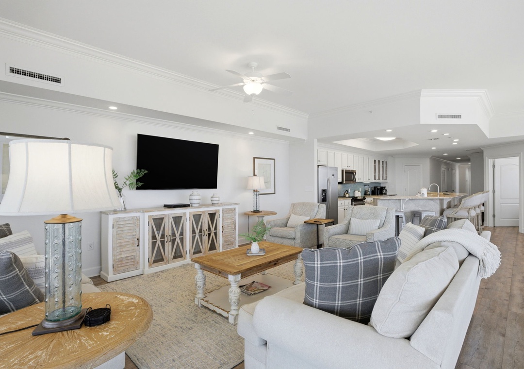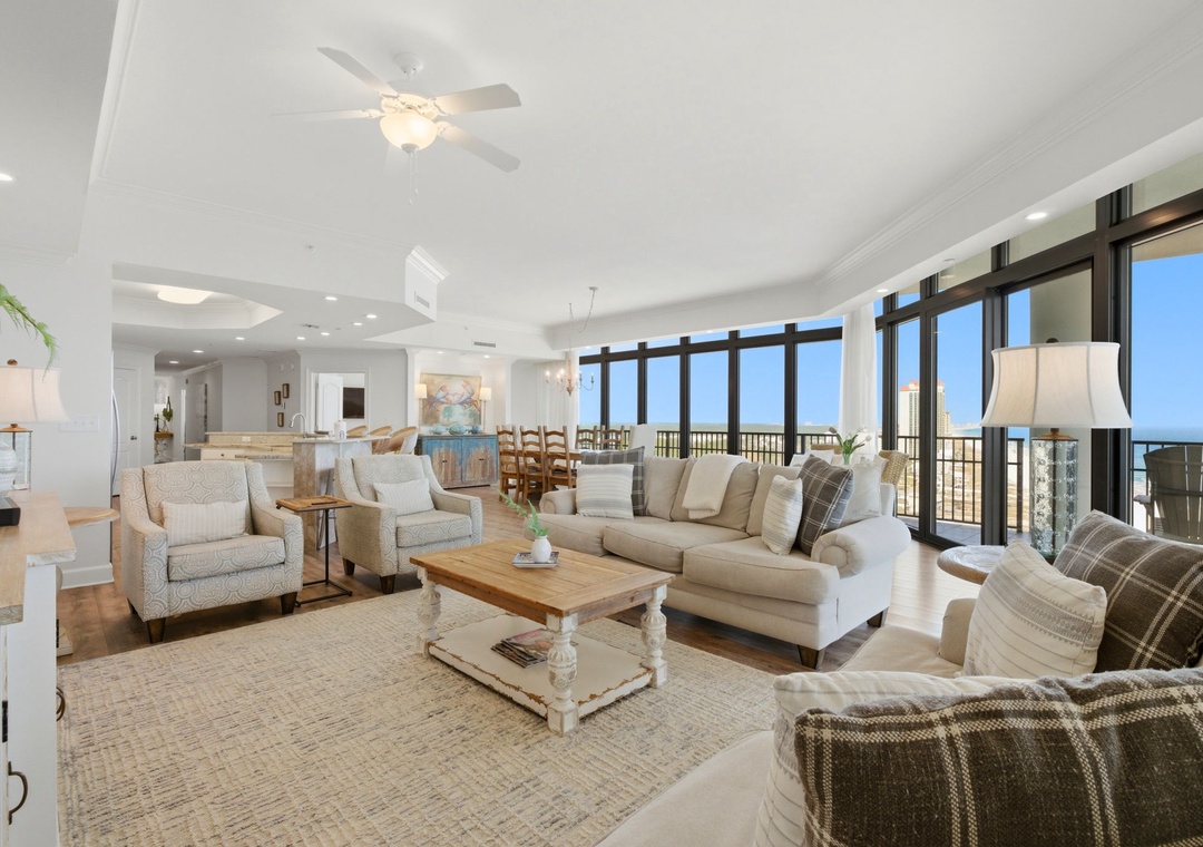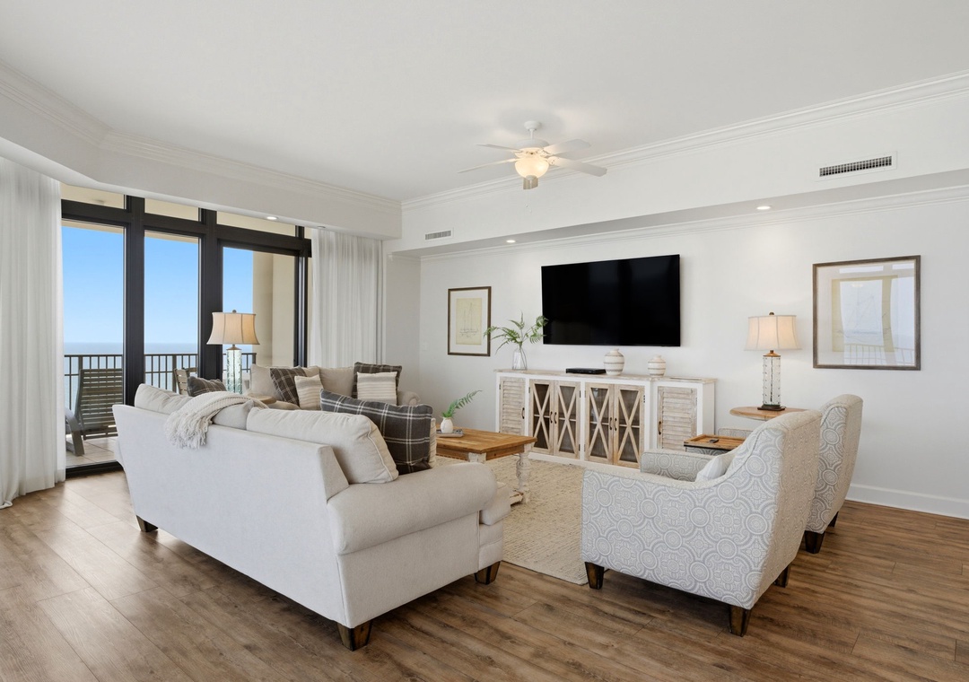 Experience unparalleled luxury at The Oasis at Orange Beach. This 4-bedroom, 16th-floor retreat showcases a beach-chic style with a contemporary coastal cottage aesthetic, creating a spa-like ambiance for relaxation. The living area, surrounded by floor-to-ceiling walls, offers ample seating and an enormous wall-mounted HD television, perfect for family movie nights. The covered balcony provides panoramic views of the Gulf, inviting you to enjoy your morning coffee, a glass of wine, or a meal while serenaded by the tranquil sounds of the surf.