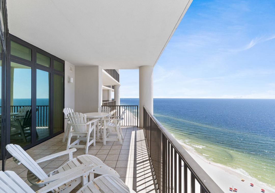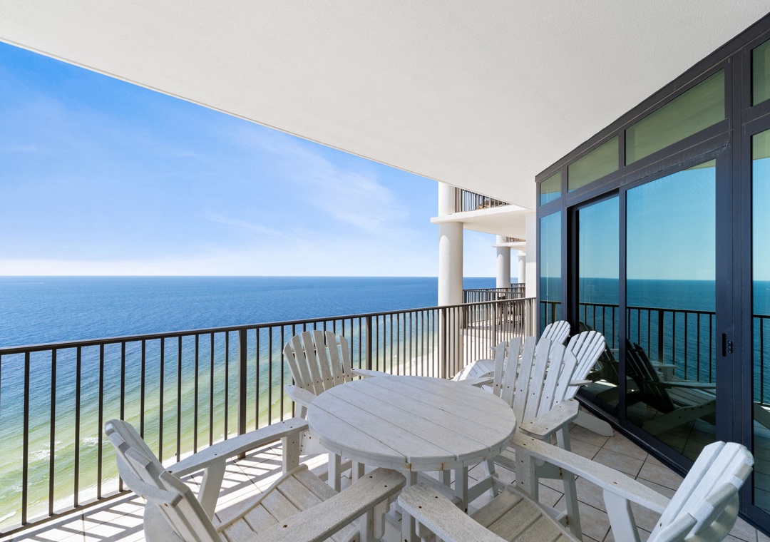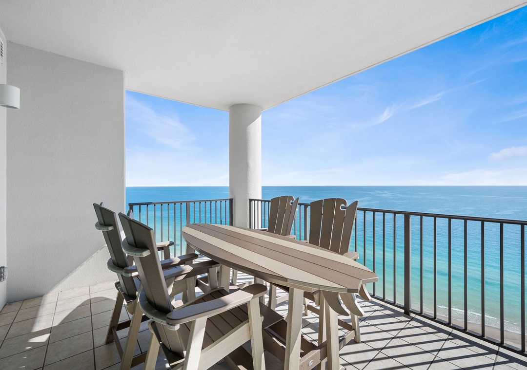 The most important aspect of any beachfront unit is the balcony, of course! And this expansive covered terrace certainly delivers. Panoramic views of the shimmering Gulf can be appreciated from every angle! With plenty of seating you can enjoy your morning coffee, savor a glass of wine or a delicious meal, while the tranquil sounds of the surf serenade you into serenity!