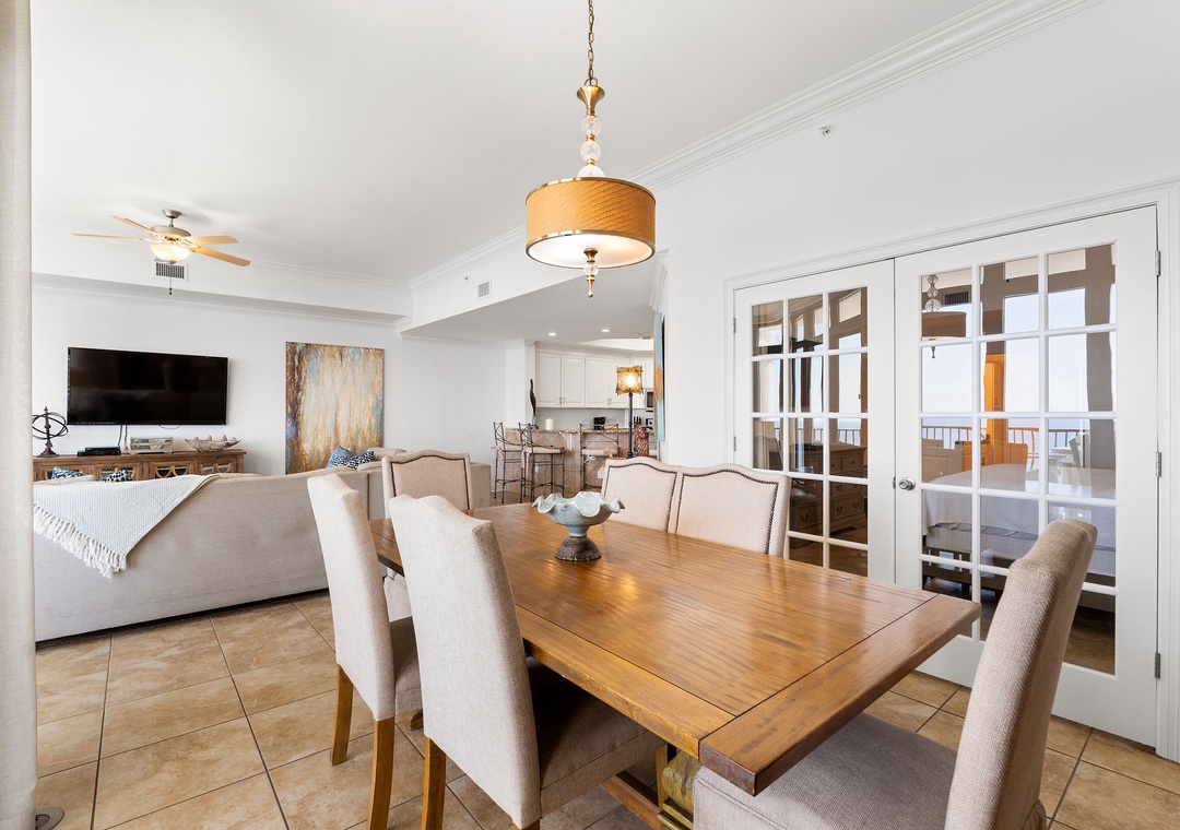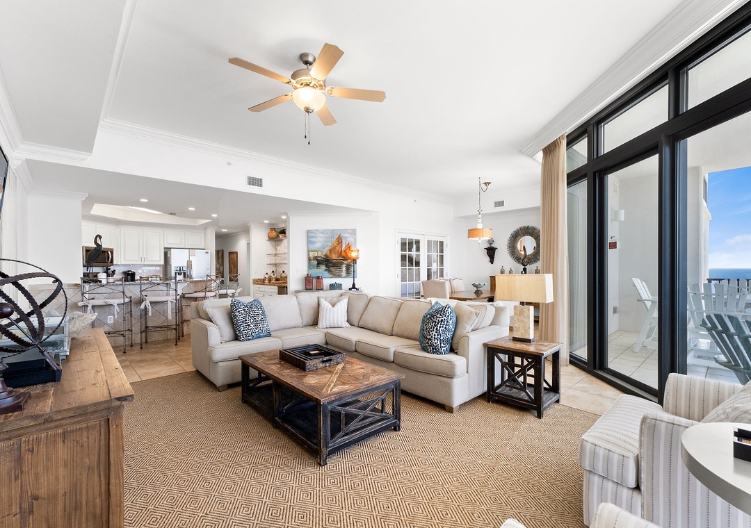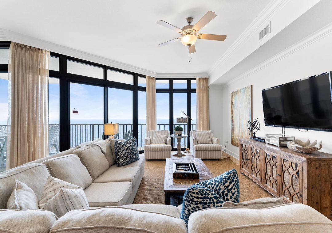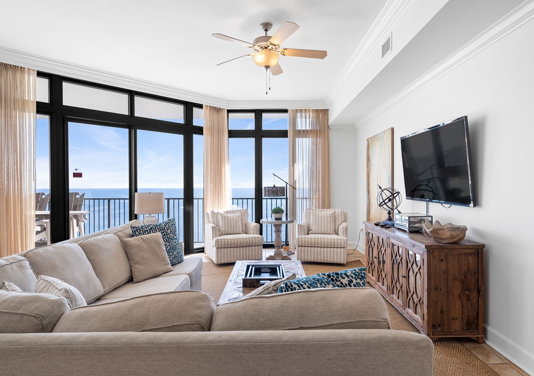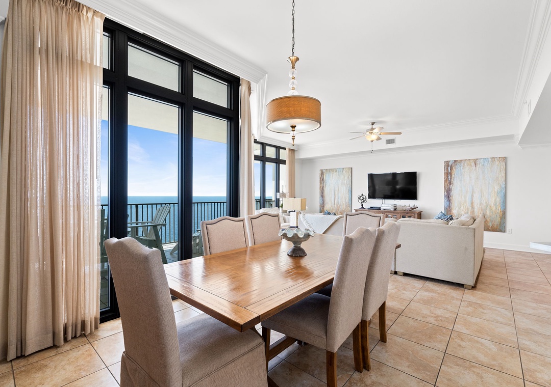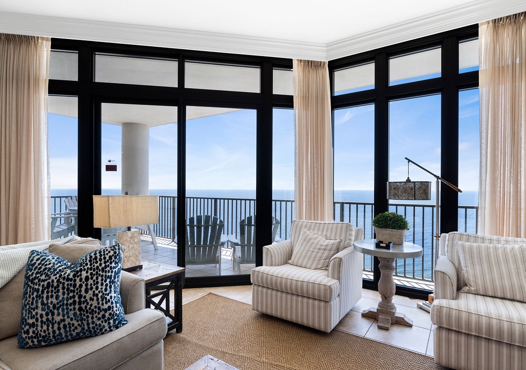 Experience the ultimate vacation destination when you visit this stunning 3 bedroom 22nd floor unit! This condo offers everything you need for your long awaited trip, featuring a spacious and open concept layout, premium finishes and lavish touches throughout, not to mention everything in the unit is entirely brand new! The living area offers plenty of seating, featuring a plush sofa and loveseat and two leather embellished side chairs- perfect for a night in with the family to watch a movie on the huge wall-mounted flat-screen television! Floor to ceiling walls surround the living and dining areas, which are teeming with natural light and views of the Gulf of Mexico.