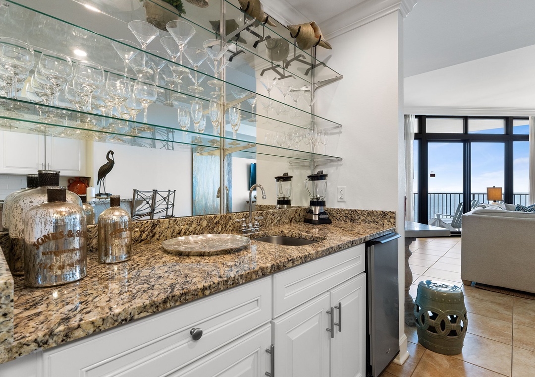 The kitchen is a chef’s dream, featuring granite countertops, stainless steel appliances, custom cabinetry, a unique custom tiled backsplash, and an expansive breakfast bar including seating for 4! Stir or shake up your favorite cocktail at the wet bar, offering an under counter ice maker, wine chiller and elegant stemware!