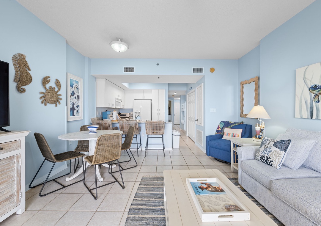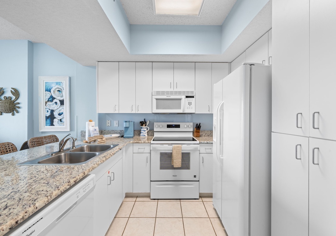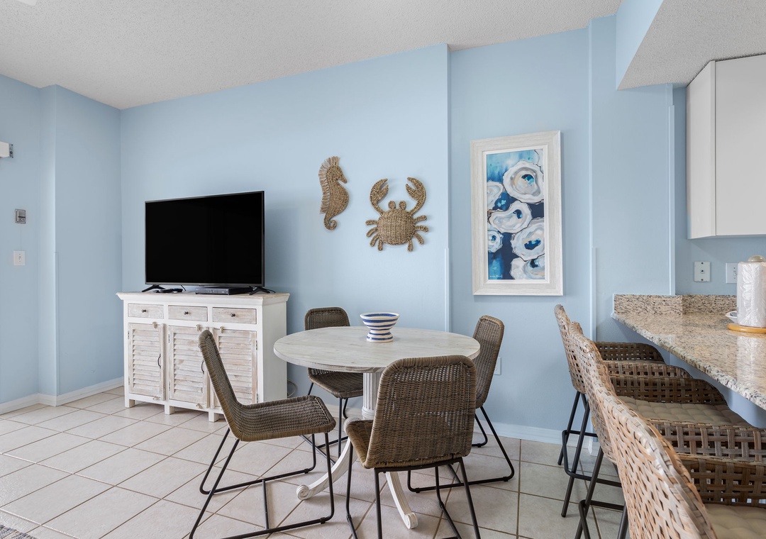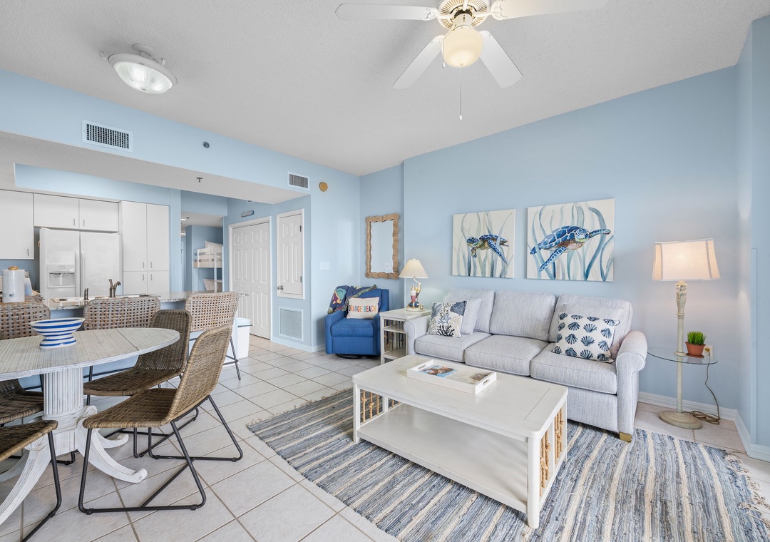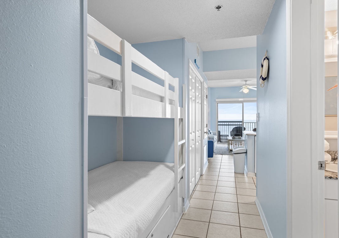 Inside, the gourmet kitchen comes equipped with all the appliances, utensils, and cookware you need to prepare meals with ease. The open-concept living space ensures that Gulf views can be enjoyed from nearly every corner of the condo. The bedroom features a plush queen bed with deluxe bedding and a wall-mounted flat-screen TV, while the ensuite bath offers a convenient shower/tub combo. A bonus bunk alcove in the hallway provides the perfect space for kids, and the sleeper sofa makes it easy to accommodate up to six guests. Additional conveniences include a full-size washer and dryer and oversized bath towel sets. Book your stay at Tidewater 503 and experience the vacation of your dreams!