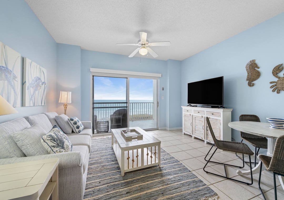 Escape to a cozy coastal retreat at Tidewater 503, a 5th-floor beachfront condo on the sugar-white sands of the Gulf Coast. This 1-bedroom unit offers everything needed for the perfect weekend getaway, from plush seating and a comfortable breakfast nook to an enormous flat-screen TV for relaxing evenings. Step out onto your private, covered balcony and soak in the stunning views of the Gulf of Mexico, where the soft quartz sands and emerald waters stretch endlessly. Whether you're sipping morning coffee while watching the sunrise or unwinding with a glass of wine as the moon reflects over the waves, this serene spot promises relaxation.