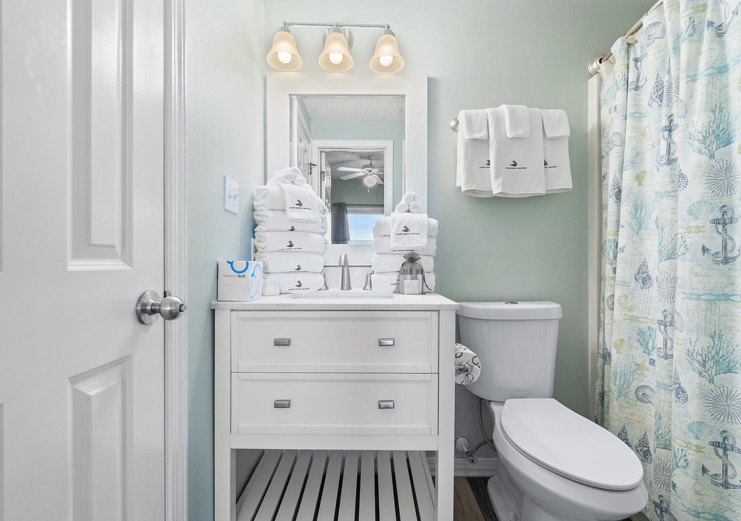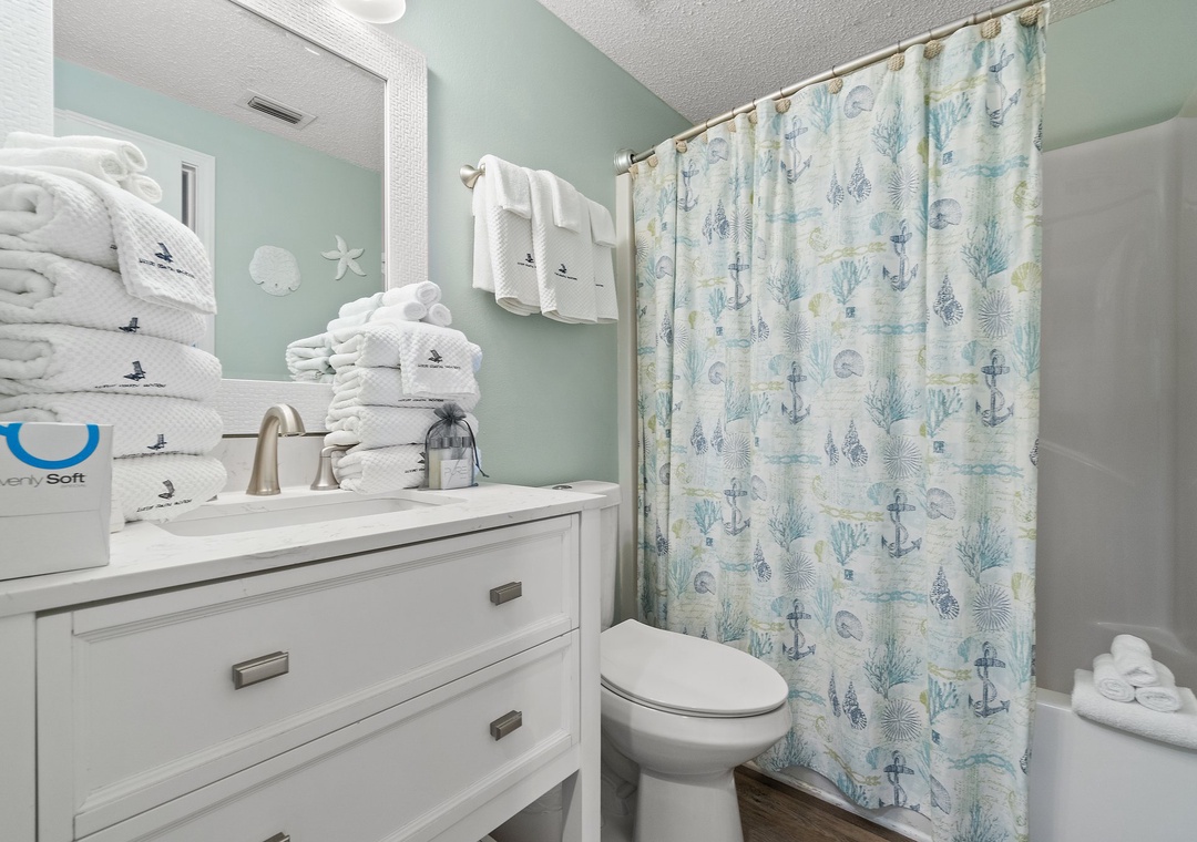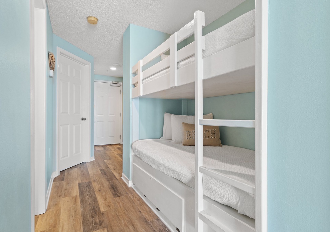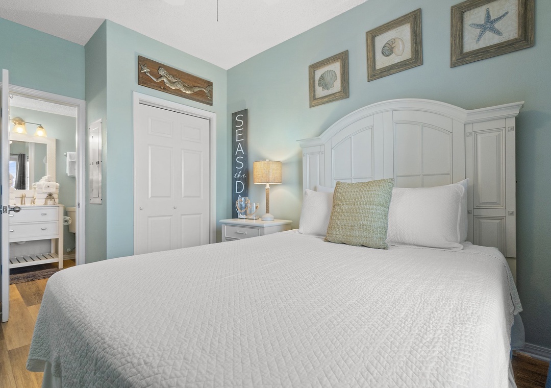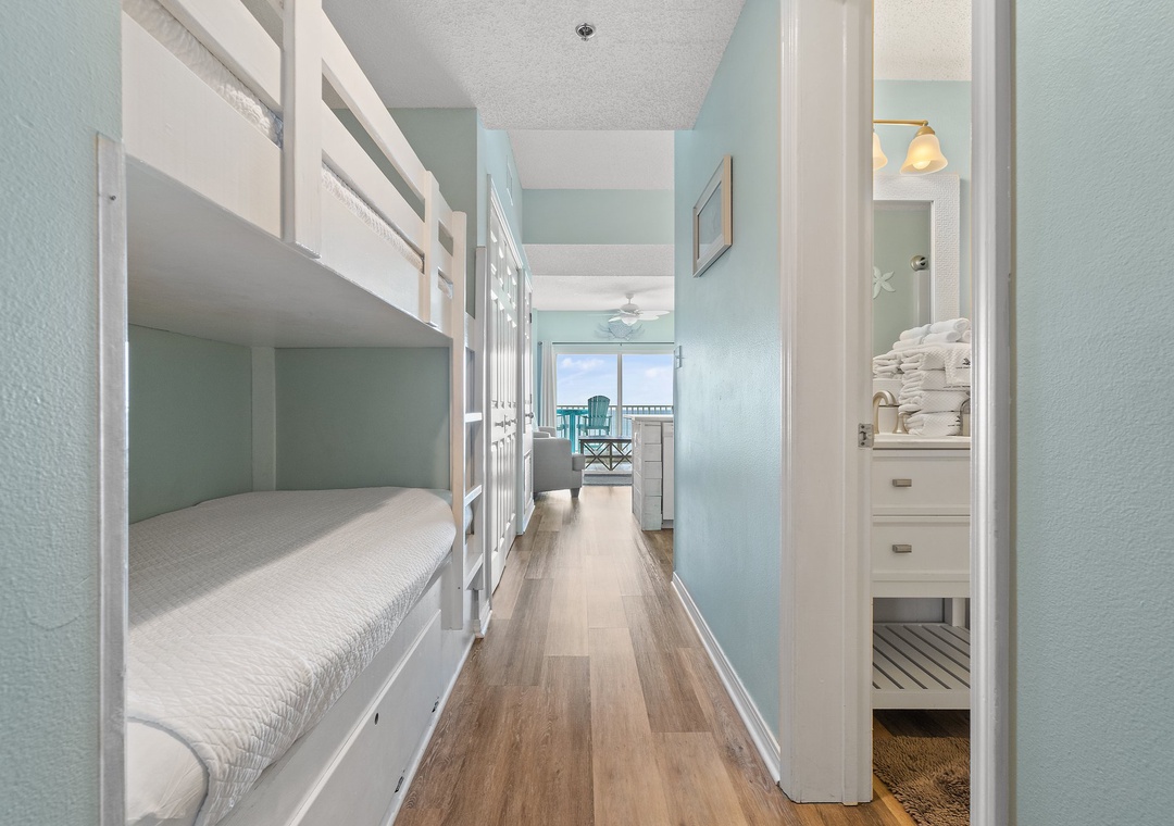This thoughtfully designed condo accommodates up to six guests. The primary bedroom offers a plush queen bed with premium bedding, a wall-mounted flat-screen TV, and a serene ambiance for restful nights. Kids will love the cozy bunk alcove in the hallway, and the living room sofa easily converts into a sleeper to accommodate additional guests. The ensuite bathroom features a convenient tub/shower combo and is stocked with oversized plush bath towels for your comfort.