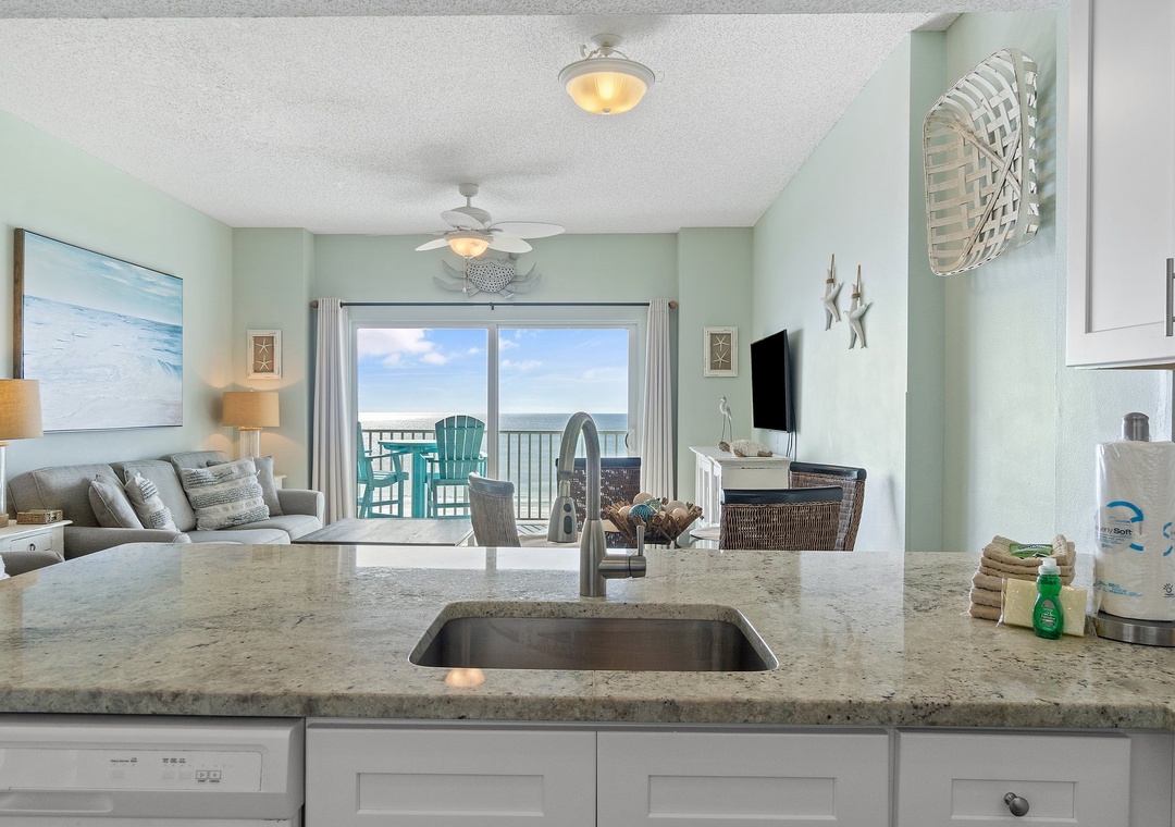 Tidewater 703 is a cozy coastal retreat located on the 7th floor of a beachfront complex in Orange Beach, AL. Step onto your private Gulf-front balcony and take in the breathtaking views of sugar-white sands and turquoise waters stretching to the horizon. Start your mornings with a cup of coffee as the sun rises over the Gulf, or unwind in the evenings with a glass of wine while the soothing sounds of the waves melt your stress away. Inside, the open-concept living space features plush seating, a comfortable breakfast nook, and a large flat-screen TV, making it the perfect spot to relax after a day on the beach. The fully equipped gourmet kitchen has everything you need to prepare meals, from small appliances to cookware and utensils.