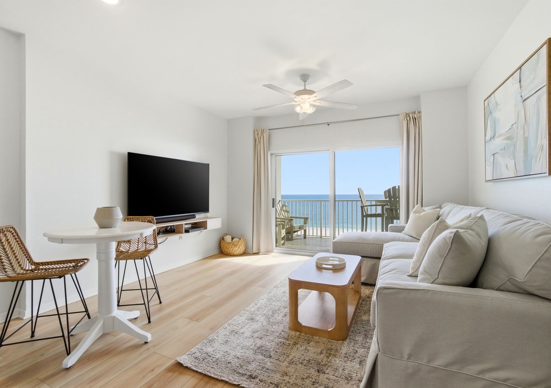 Escape to a cozy coastal retreat at Tidewater 804, a 8th-floor beachfront condo on the sugar-white sands of the Gulf Coast. This 1-bedroom unit offers everything needed for the perfect weekend getaway, from plush seating and a comfortable breakfast nook to an enormous flat-screen TV for relaxing evenings. Step out onto your private, covered balcony and soak in the stunning views of the Gulf of Mexico, where the soft quartz sands and emerald waters stretch endlessly. Whether you're sipping morning coffee while watching the sunrise or unwinding with a glass of wine as the moon reflects over the waves, this serene spot promises relaxation.
