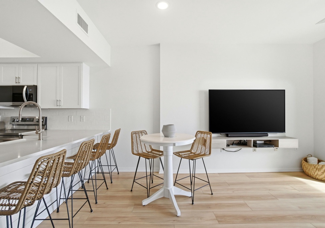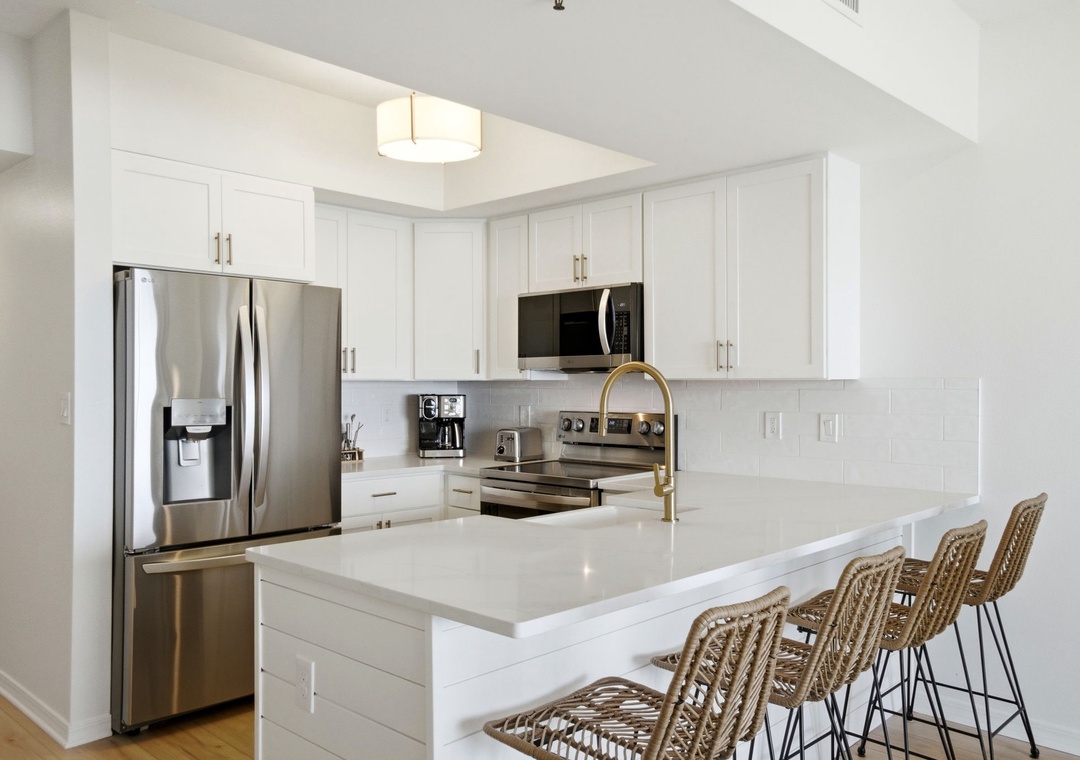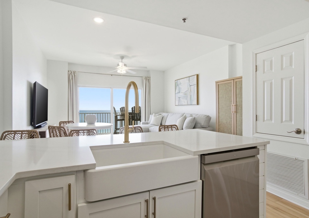 Inside, the gourmet kitchen comes equipped with all the appliances, utensils, and cookware you need to prepare meals with ease. The open-concept living space ensures that Gulf views can be enjoyed from nearly every corner of the condo. The bedroom features a plush queen bed with deluxe bedding and a wall-mounted flat-screen TV, while the ensuite bath offers a convenient shower/tub combo. A bonus bunk alcove in the hallway provides the perfect space for kids, and the sleeper sofa makes it easy to accommodate up to six guests. Additional conveniences include a full-size washer and dryer and oversized bath towel sets. Book your stay at Tidewater 503 and experience the vacation of your dreams!