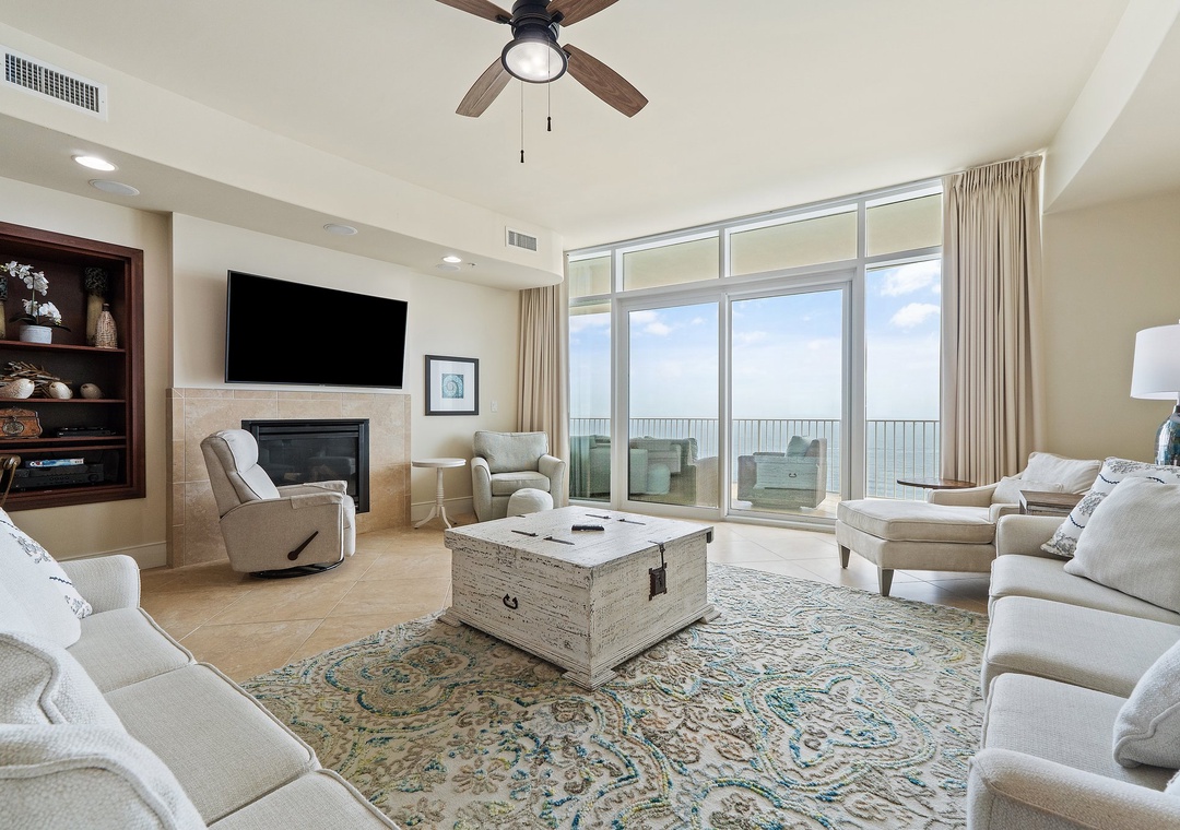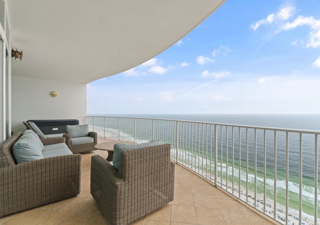 The gourmet kitchen is a chef's dream, boasting expansive granite countertops, high-end stainless appliances, a Sub Zero fridge/freezer, a five-burner gas stove, and an oven with a warming drawer. The wet bar includes a wine fridge and standalone ice maker, while the laundry room features a high-efficiency washer and dryer. Step onto the expansive balcony to find an outdoor kitchen with a built-in gas grill, and your own hot tub, to soak in breathtaking views of Perdido Pass. Whether grilling your fresh catch or simply savoring your morning coffee or evening cocktail, you’ll love the chance to spot dolphins playing in the Gulf below.