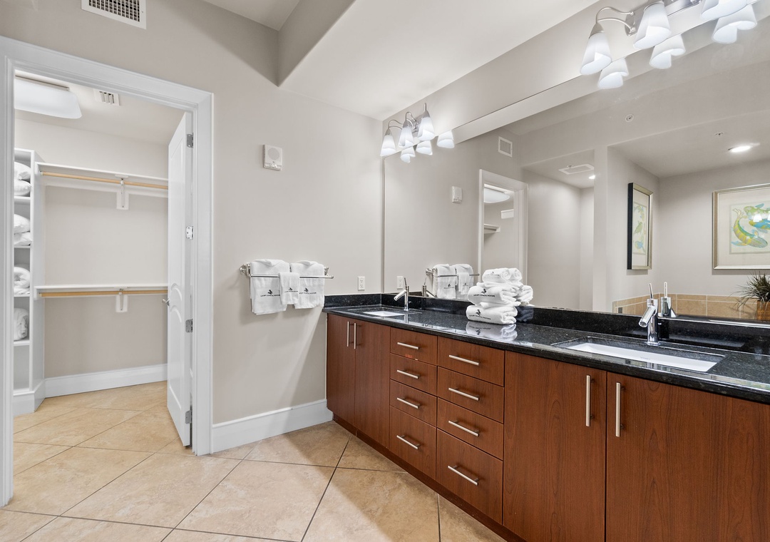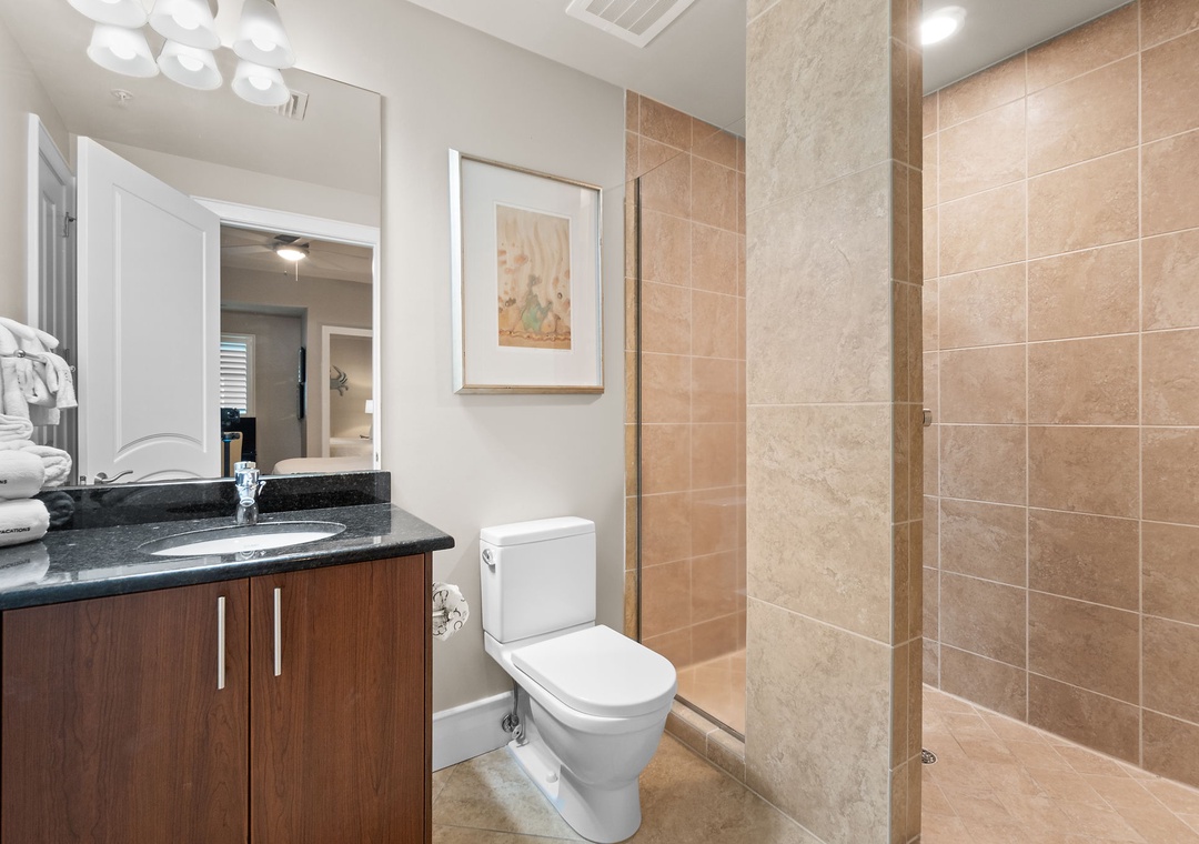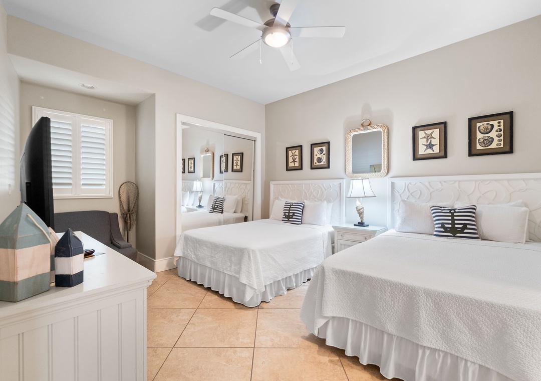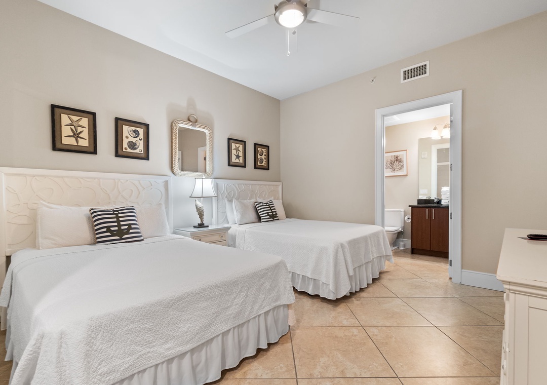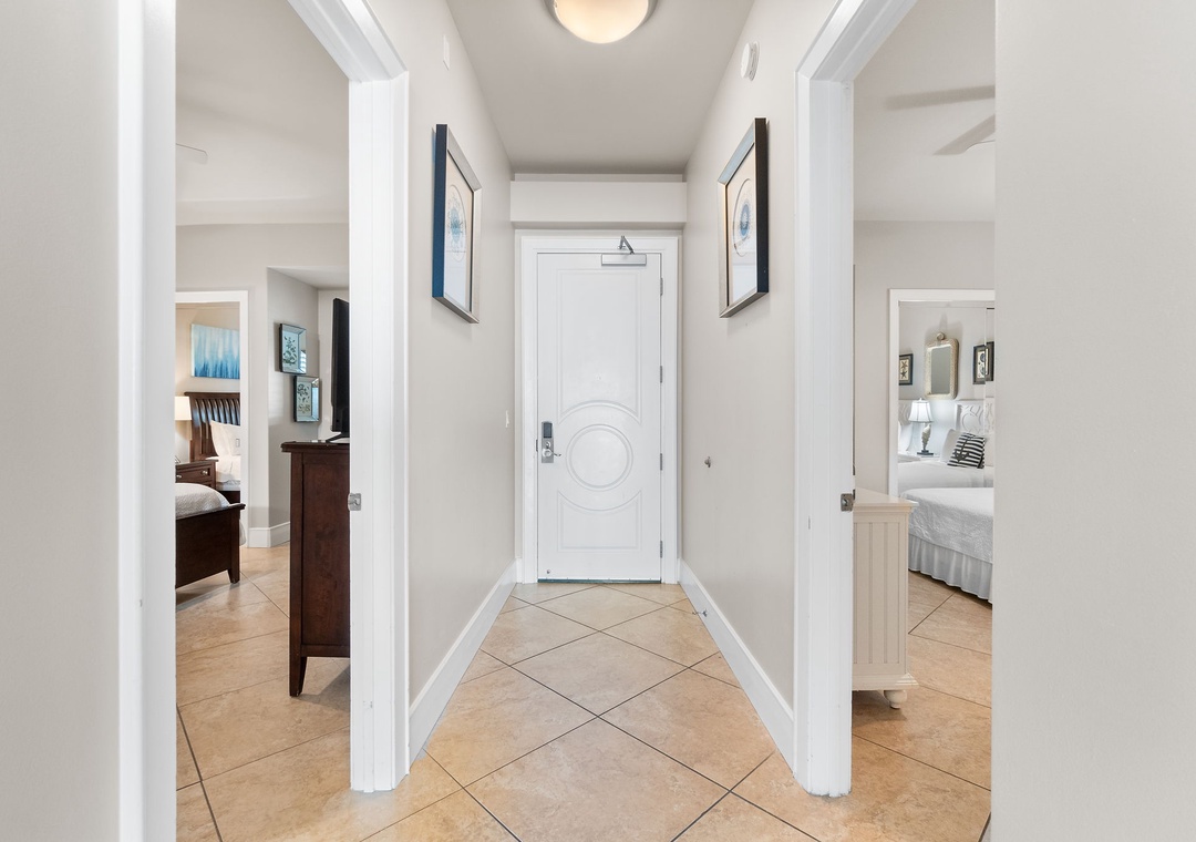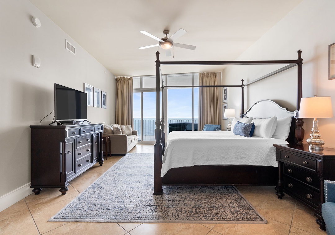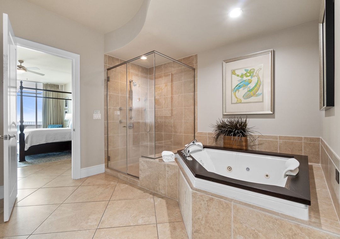 You’ll feel like royalty when you step into the master suite, which hosts a king bed with luxurious bedding and linens, a seating area with a table and two chairs, and an LCD television and beachfront balcony access. The attached glamour bath features a massive jetted tub, separate glass and tiled shower, his-and-her vanities and even a wall-mounted flat screen! The second bedroom also offers a king bed, and the third bedroom offers 2 queen beds! Every bedroom hosts premium mattresses and LCD televisions! The sofa in the living area can also be converted into a queen sleeper sofa, affording sleeping accommodations for up to 10 throughout the entire unit! There are two full private baths attached to the additional bedrooms, plus a half-bath for guests.