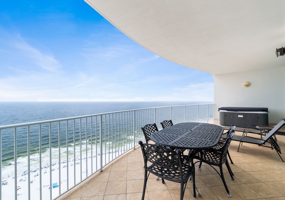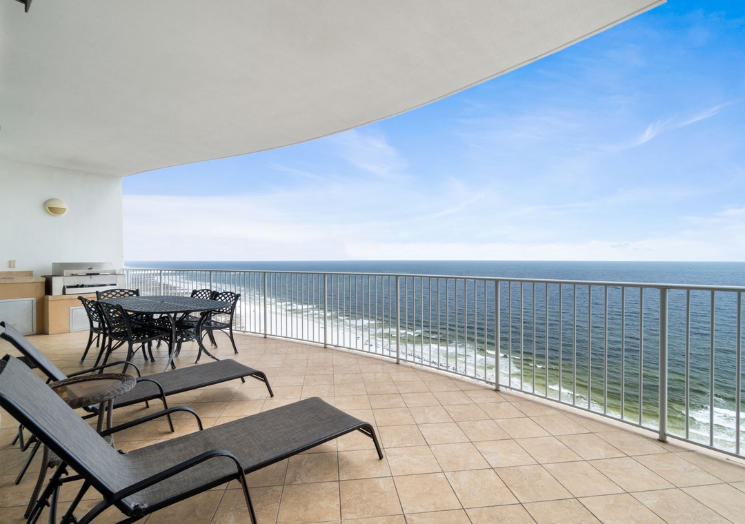 In addition to indoor living space, an expansive 400 square foot balcony offers panoramic views of Orange Beach’s picturesque seashore. Saunter away quiet moonlit evenings in your private 4 person Jacuzzi tub or enjoy your favorite cut of meat from the grill with family and friends without leaving the comfort of your unit! There is an outdoor dining table where you can savor your morning coffee, enjoy your favorite cocktail or even dine al fresco while the gentle lapping of waves and the coastal breeze soothe your senses.