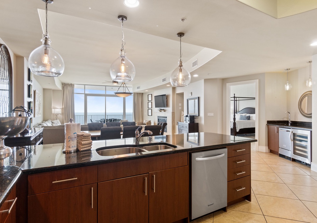 This stunning 17th floor property is located in the D tower, offering over 2400 square feet of living space including an open floor plan and beautiful glass windows spanning from the floor all the way up to the sprawling 10 foot ceilings. The living area is teeming with natural light and feels as though the beach is cascading right into the unit! Adorned with a modern yet classic color scheme and contemporary décor, this professionally decorated unit features a plush sofa, an enormous wall-mounted HD television and even a fireplace!