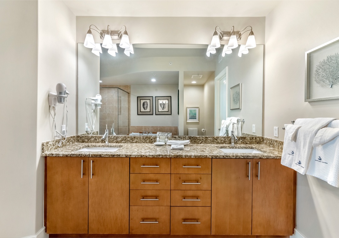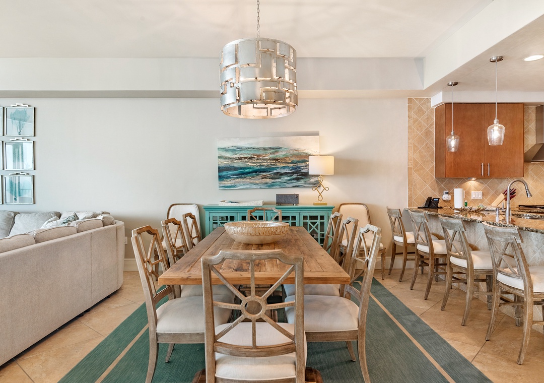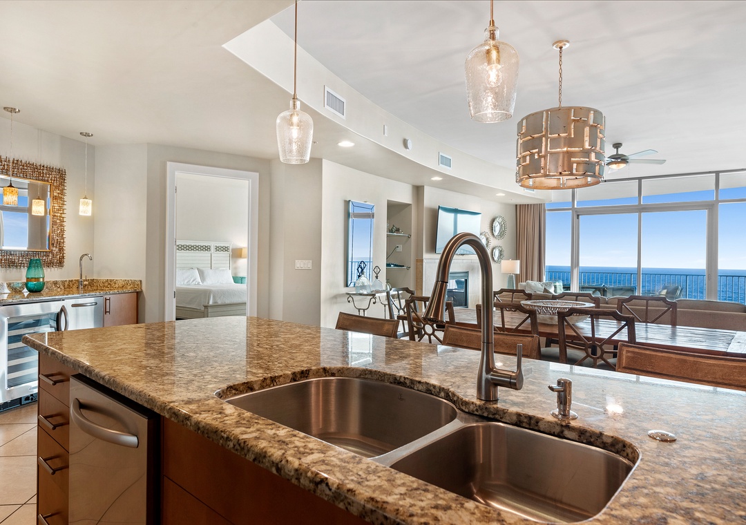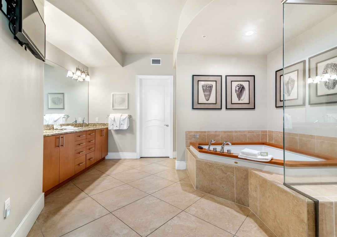 The open concept living room filled with beautiful coastal touches, is the perfect entertaining area for an evening cocktail with friends or a family game night. Featuring plush furnishings, a fireplace for those rare chilly nights, a large wall mounted flat screen and marble flooring, it doesn’t get more luxurious than this! A large dining room table has seating for 8 plus 4 additional bar seats. The fabulous wet bar includes a separate ice maker and mini wine fridge. The huge chef’s kitchen is furnished with high end appliances, as well as a multitude of cookware and utensils to craft a perfect meal.
