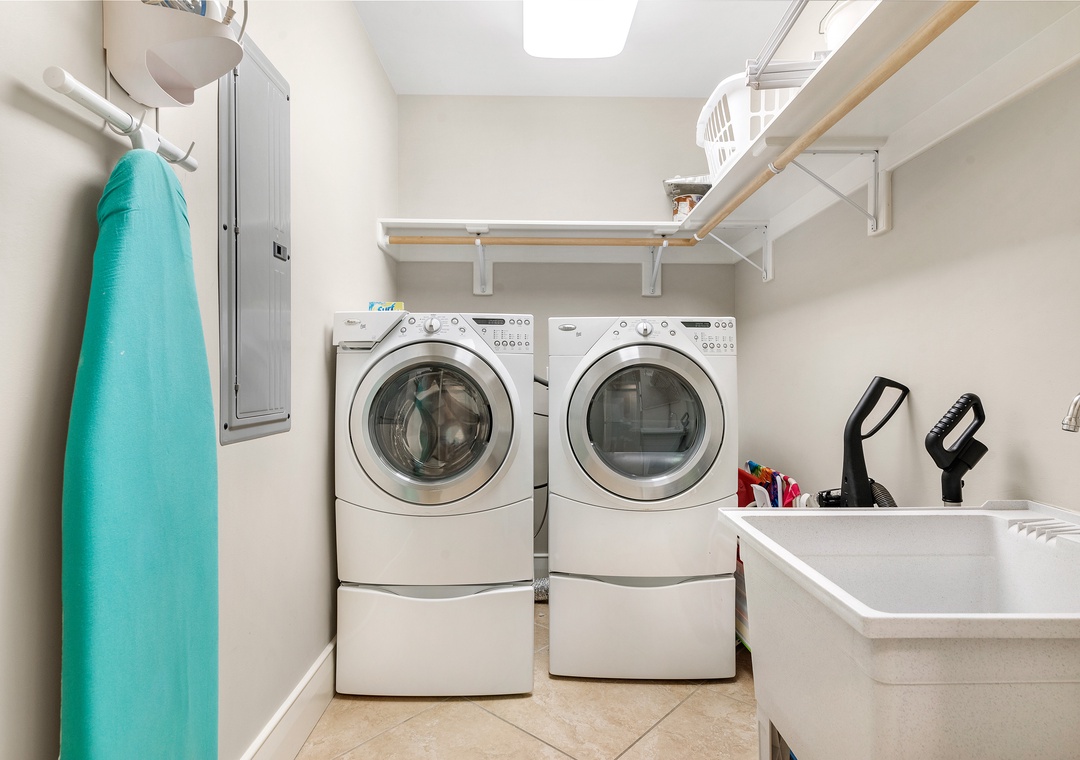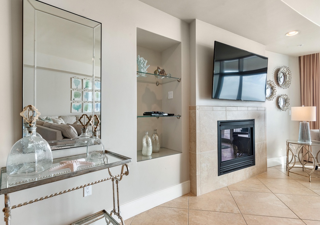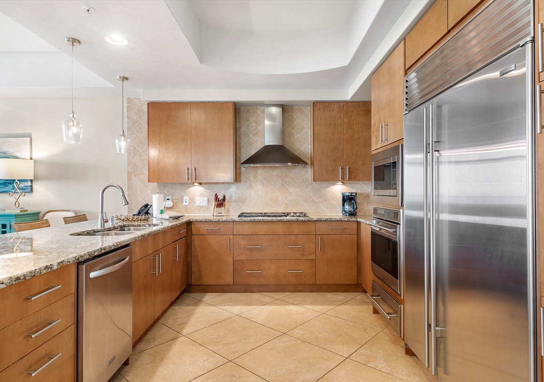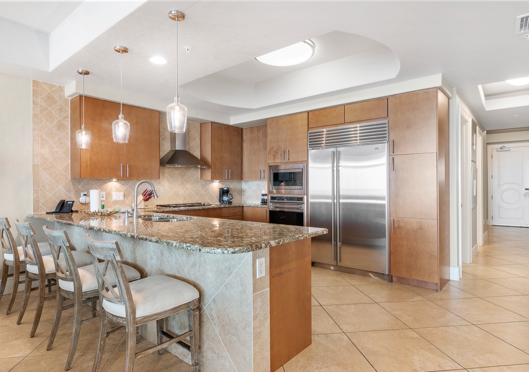 The open concept living room filled with beautiful coastal touches, is the perfect entertaining area for an evening cocktail with friends or a family game night. Featuring plush furnishings, a fireplace for those rare chilly nights, a large wall mounted flat screen and marble flooring, it doesn’t get more luxurious than this! A large dining room table has seating for 8 plus 4 additional bar seats. The fabulous wet bar includes a separate ice maker and mini wine fridge. The huge chef’s kitchen is furnished with high end appliances, as well as a multitude of cookware and utensils to craft a perfect meal.