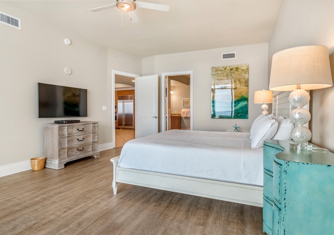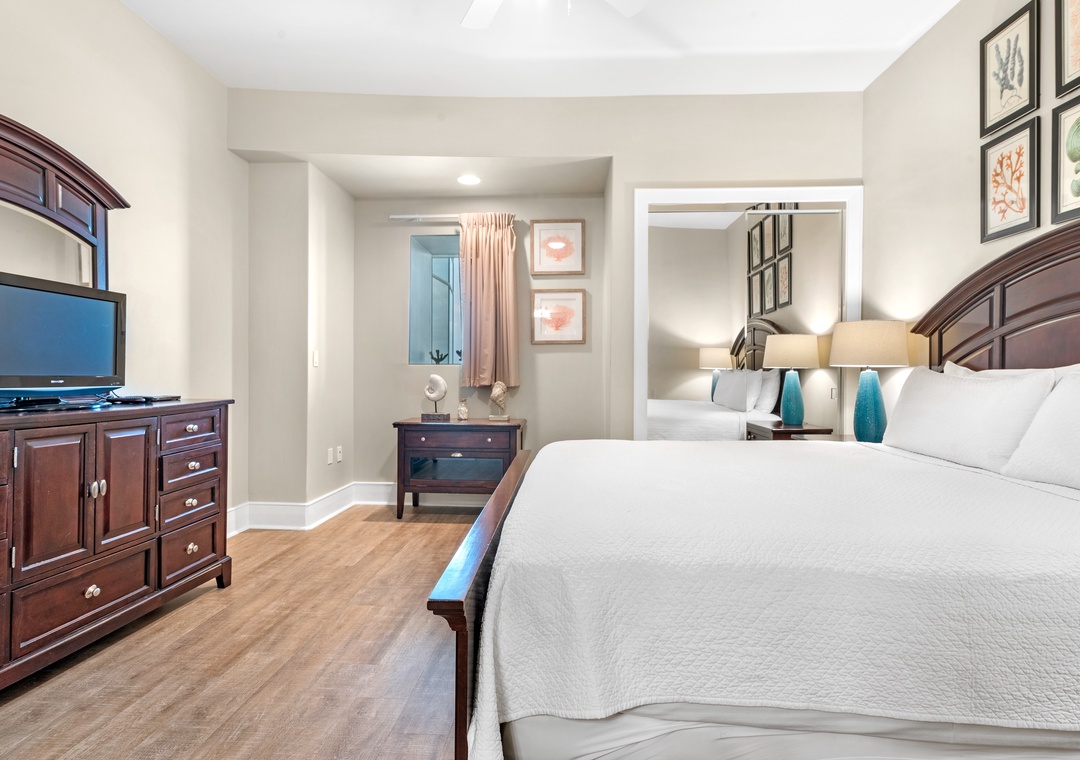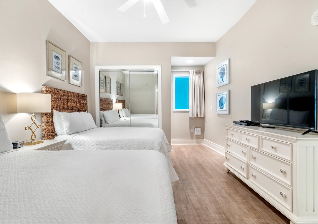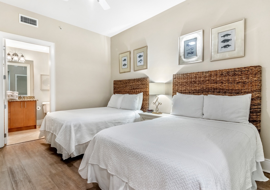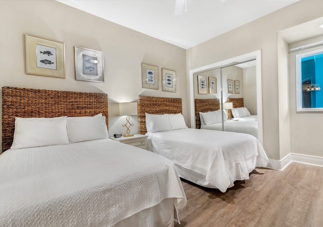 The glamorous master boasts stunning floor to ceiling windows to take in the beautiful gulf views while you lounge on the premium king mattress with luxury linens. The ensuite master bath includes dual vanities and a large jetted tub. The walk in shower features an array of high tech jets for a full body massage. The second guest bedroom is adorned in colorful coastal decor with a king sized bed and attached bath with tiled shower. The third bedroom has two full beds with a private bath.