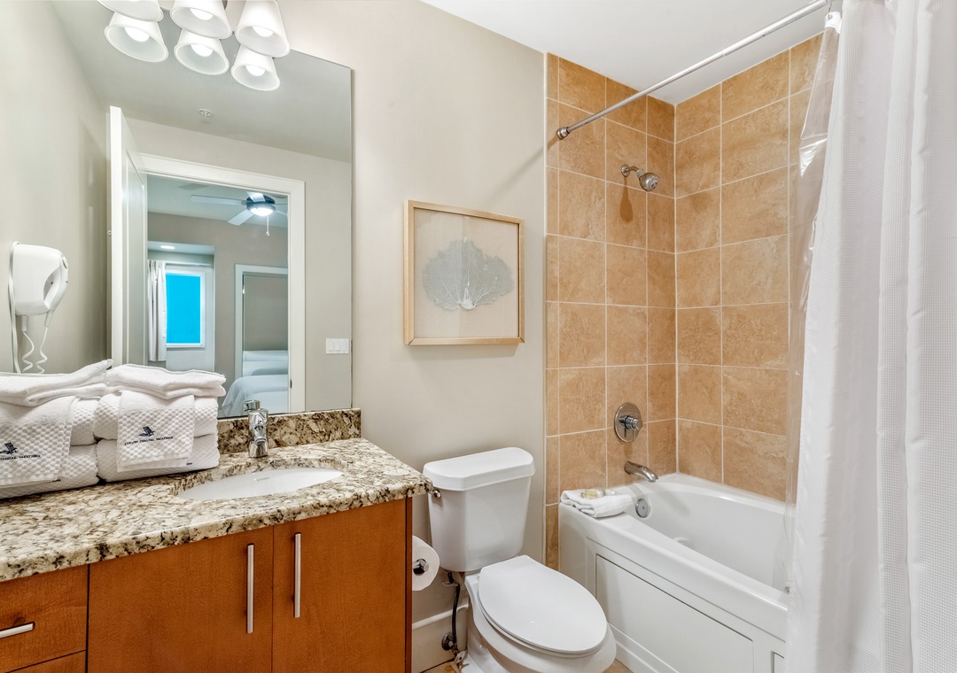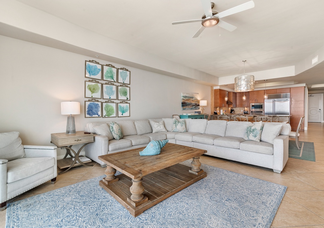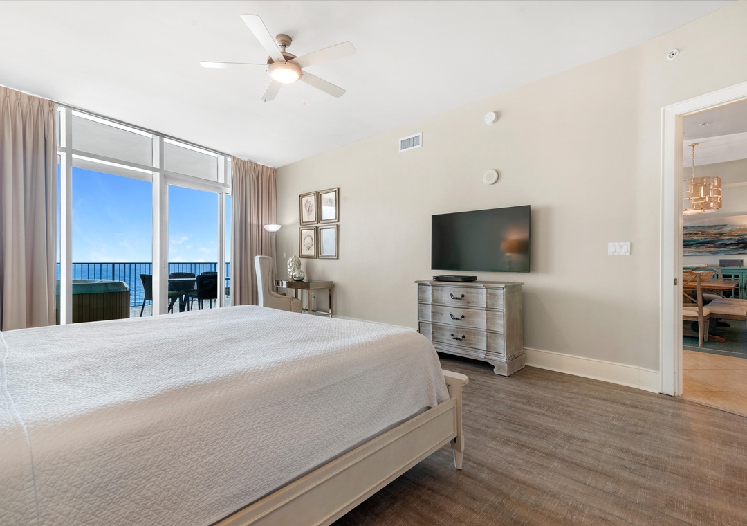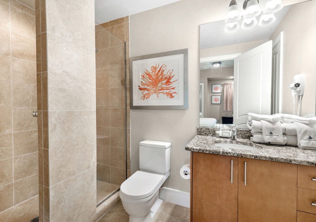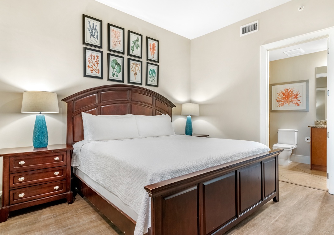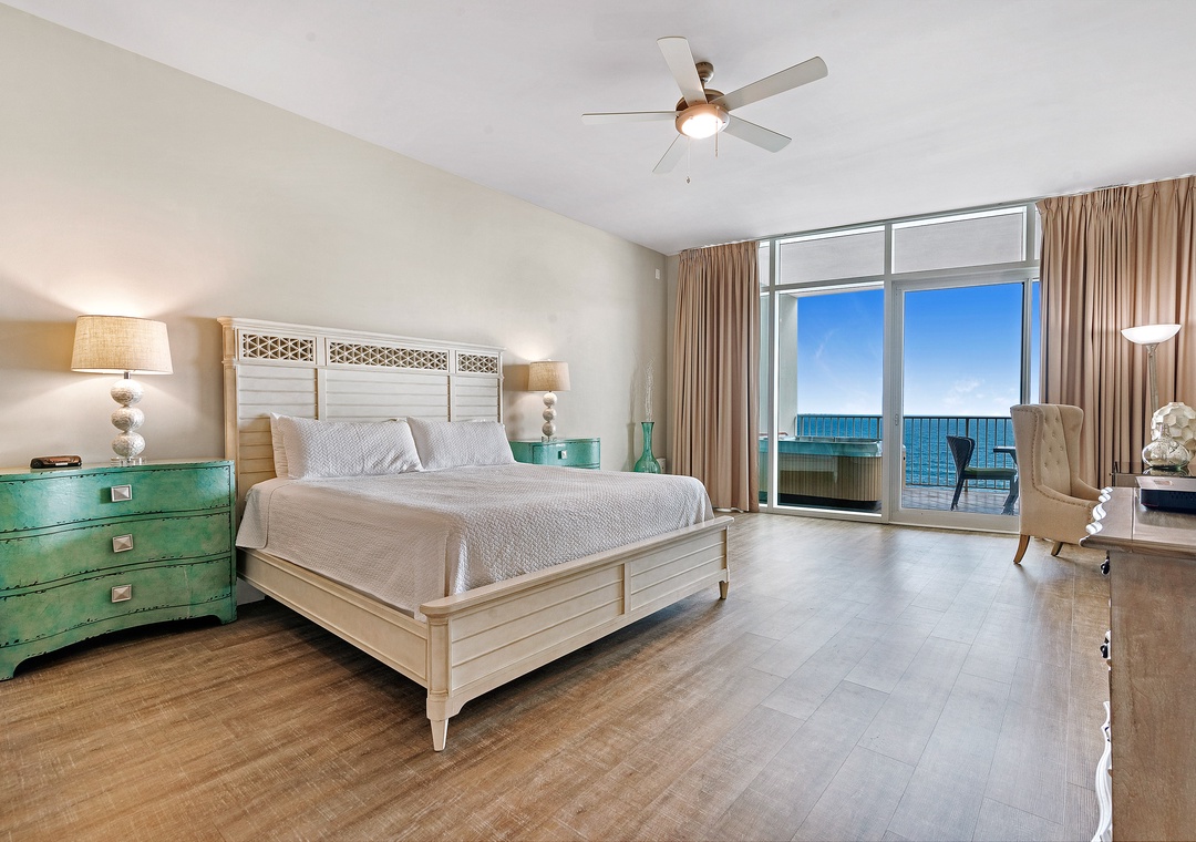 The glamorous master boasts stunning floor to ceiling windows to take in the beautiful gulf views while you lounge on the premium king mattress with luxury linens. The ensuite master bath includes dual vanities and a large jetted tub. The walk in shower features an array of high tech jets for a full body massage. The second guest bedroom is adorned in colorful coastal decor with a king sized bed and attached bath with tiled shower. The third bedroom has two full beds with a private bath.