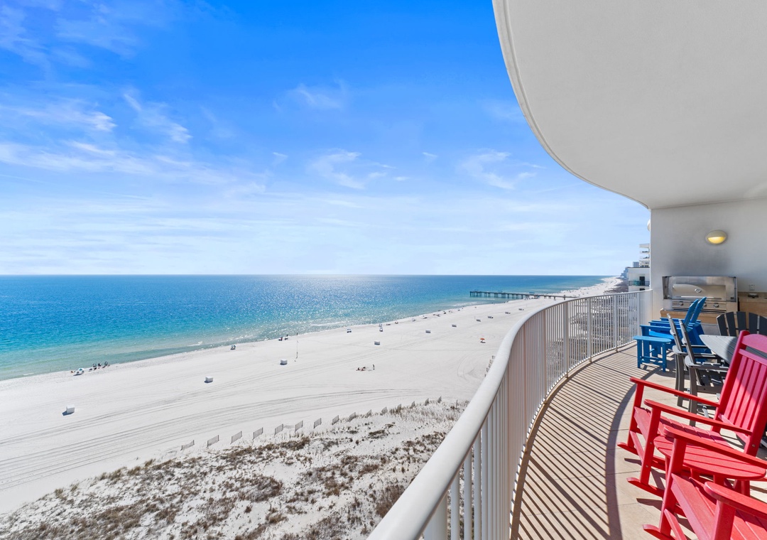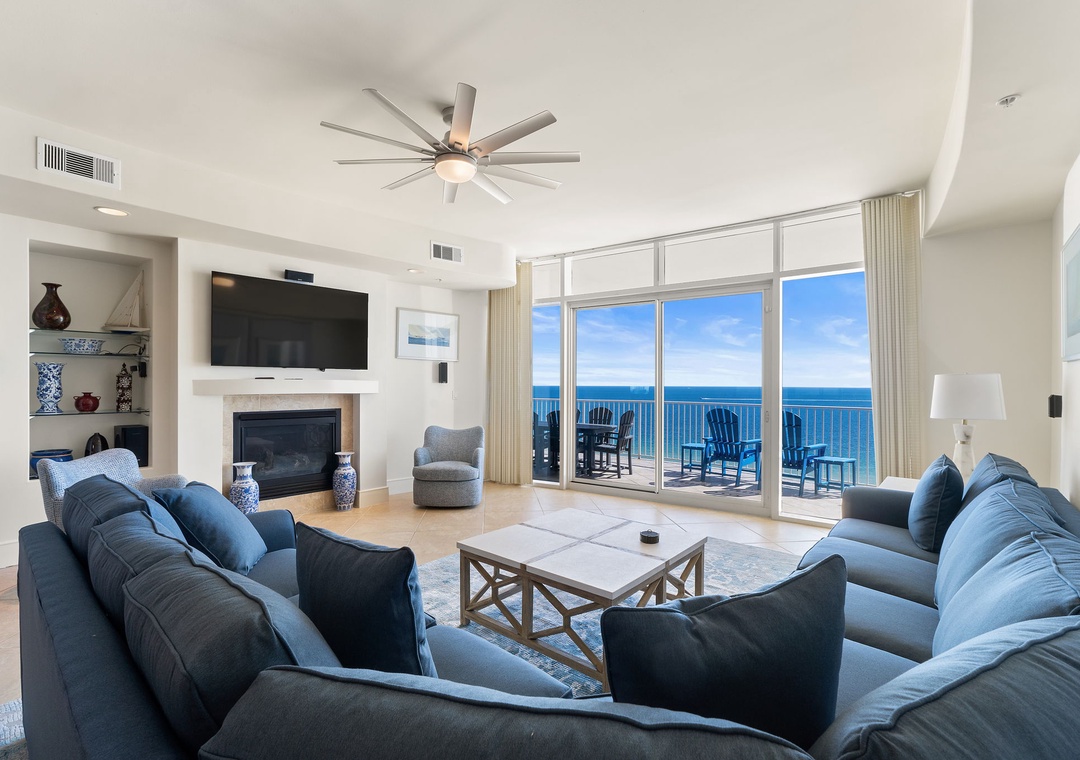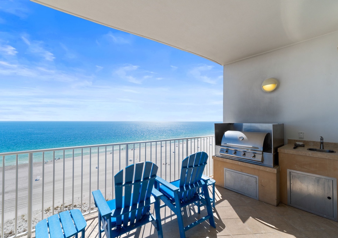 Welcome to Turquoise Place D806, a fully remodeled luxurious 3-bedroom, 3.5-bathroom beachfront condo designed for relaxation and entertainment. Step onto your private balcony, where you'll find an outdoor kitchen with a gas grill, sink, and a private hot tub—perfect for soaking up stunning views. Inside, the living room invites you to unwind with a cozy fireplace, a large TV, and a spacious sectional. The gourmet kitchen, complete with high-end stainless-steel appliances and a wet bar featuring a standalone ice maker and wine cooler, is ideal for hosting. The primary suite offers a king bed, full sleeper, balcony access, and a spa-like bathroom with a jetted tub, walk-in shower, and dual vanities. The second bedroom includes a king bed and an ensuite with a tub/shower combo, while the third bedroom offers both a king bed and a twin bed with its own bathroom and walk-in shower.