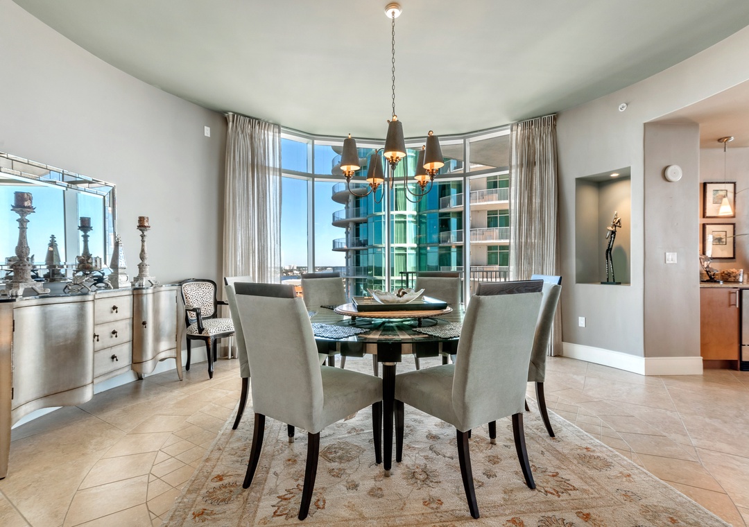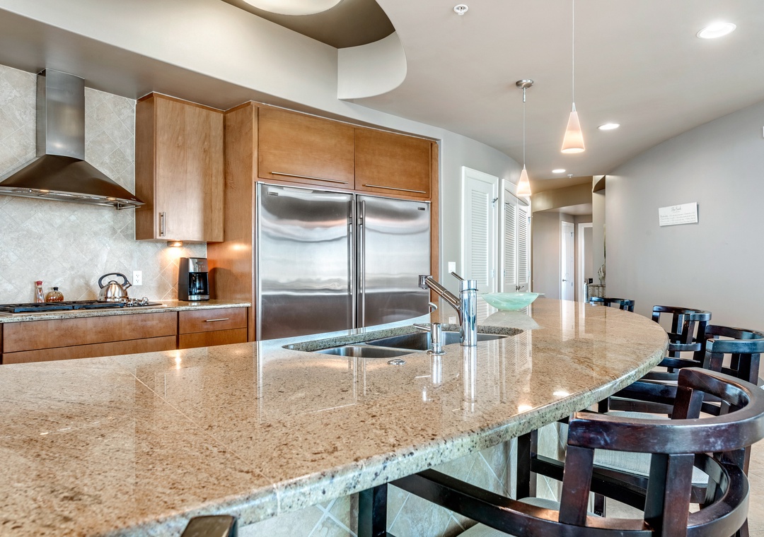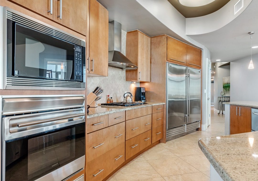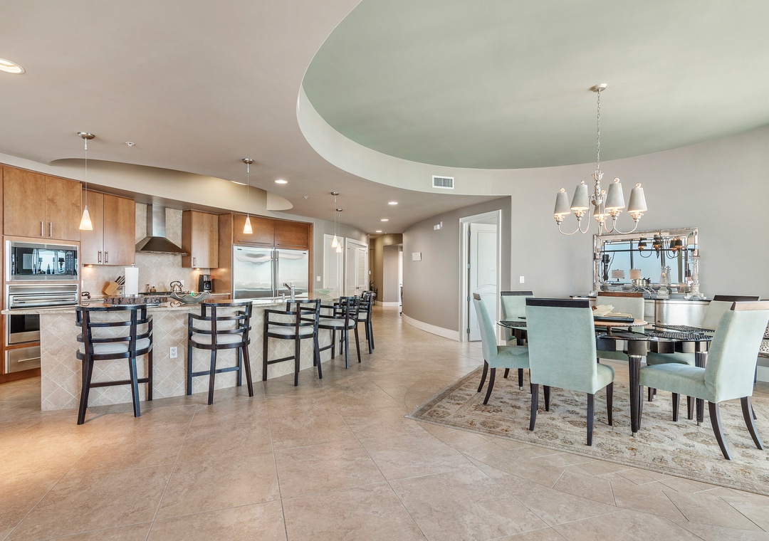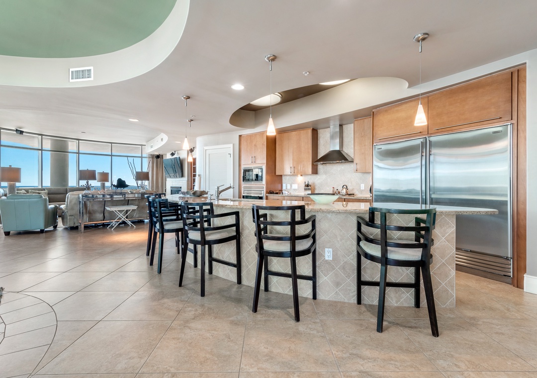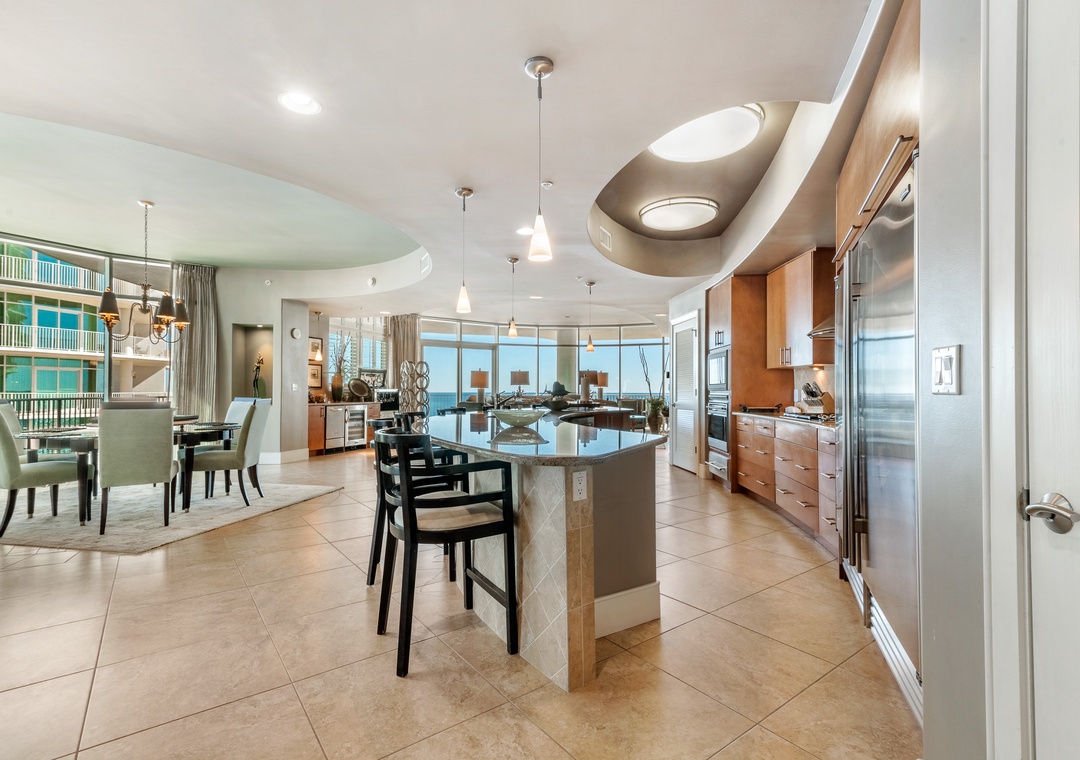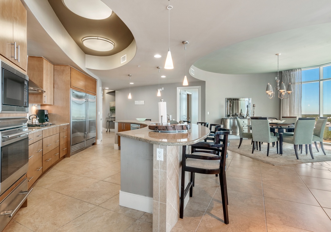 Step out onto the oversized balcony to enjoy your private hot tub, outdoor kitchen with a gas grill, and incredible panoramic views. Inside, the gourmet kitchen is a chef’s dream, equipped with WOLF appliances, a Sub-Zero refrigerator, granite countertops, and a wet bar with a wine chiller and ice maker. The dining area comfortably seats eight at the table, with additional seating for six at the breakfast bar, making it ideal for entertaining family and friends. Every detail has been thoughtfully designed to ensure your stay is as comfortable and memorable as possible.