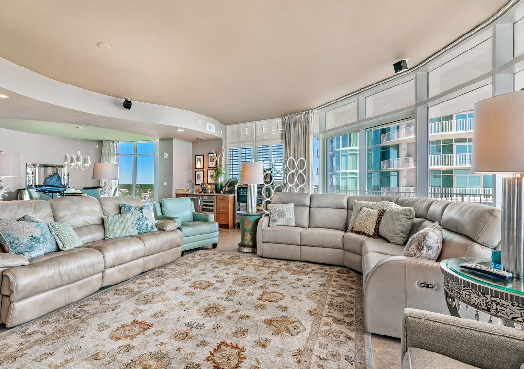 Experience the ultimate coastal getaway in this stunning 9th-floor corner unit at Turquoise Place, a premier destination in Orange Beach. This professionally decorated, 4-bedroom, 4.5-bath condo offers over 3,600 square feet of luxury, complemented by breathtaking views of the Gulf Coast's pristine white sands and emerald waters. The open floor plan, floor-to-ceiling glass windows, and modern beach-inspired décor create a sophisticated yet inviting atmosphere, perfect for relaxation and rejuvenation. Situated on over 900 feet of Gulf frontage, Turquoise Place redefines opulence and style as the most luxurious resort in Orange Beach.