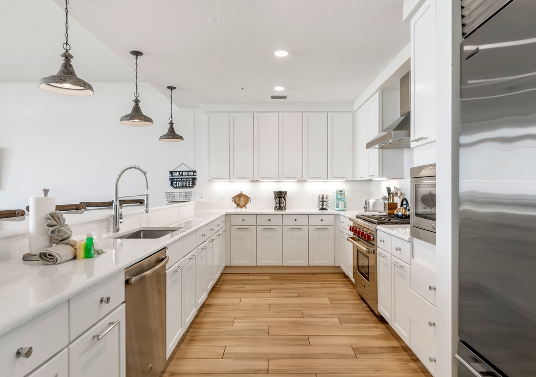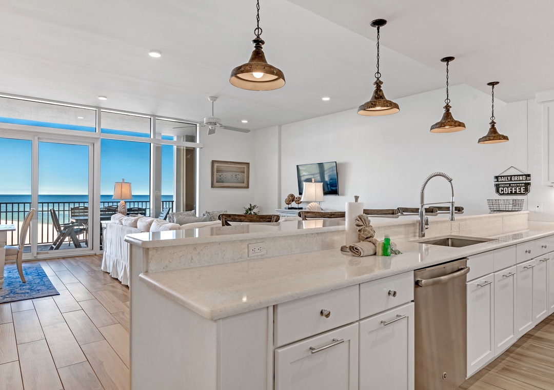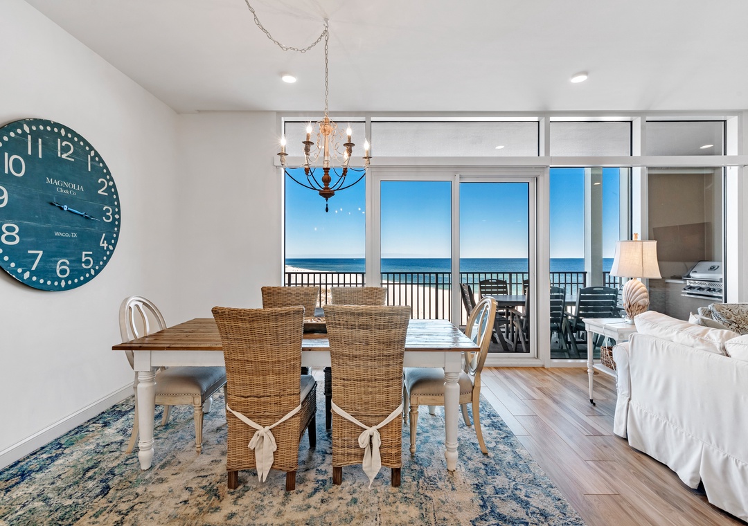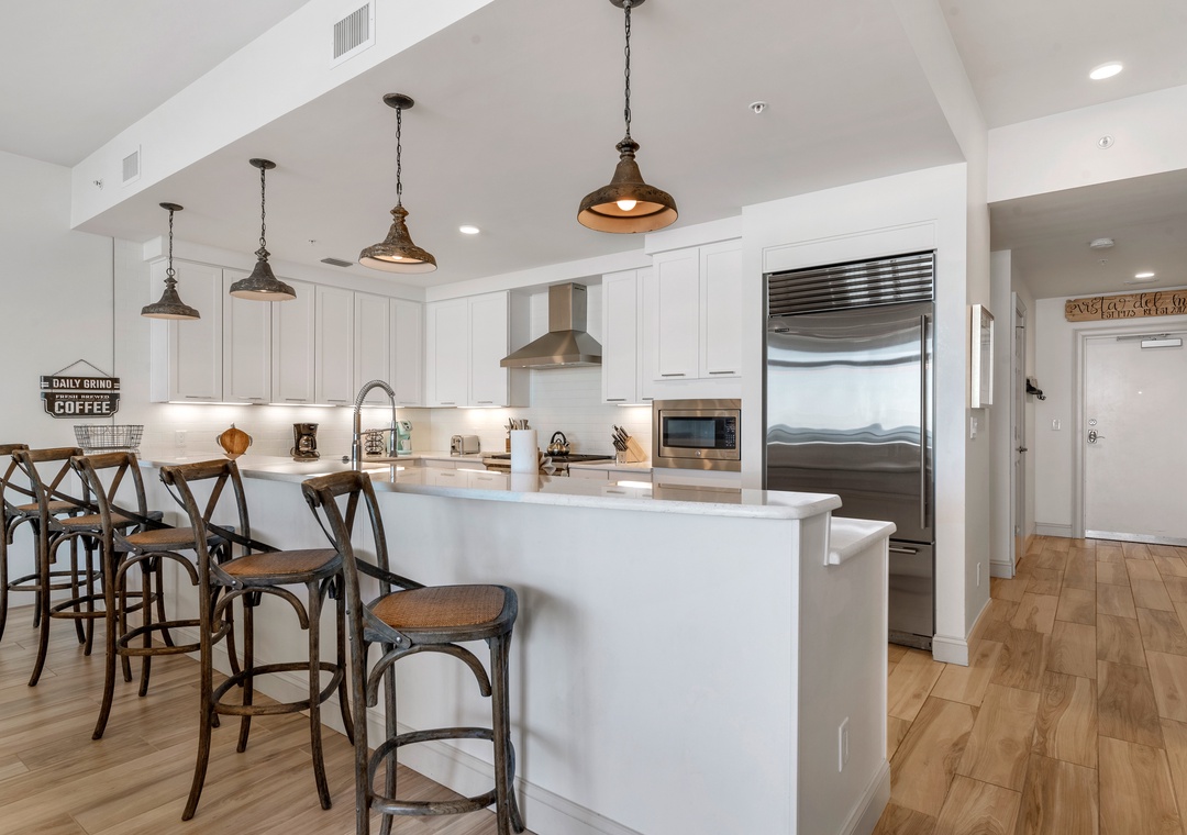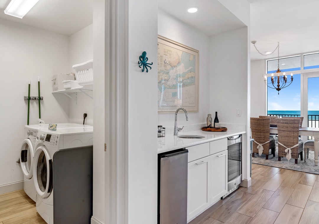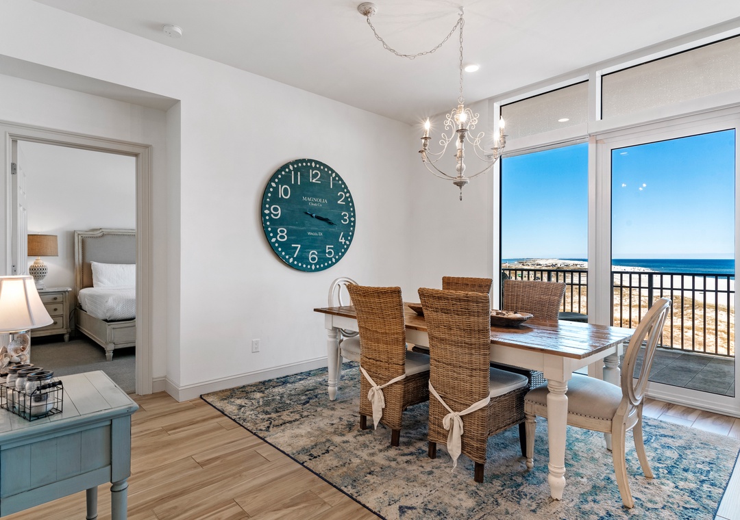 The state-of-the-art kitchen is equal parts aesthetics and function, featuring brand new commercial stainless appliances, custom cabinetry, granite counters and all the small appliances, cookware and utensils necessary to inspire your inner-chef. A spacious breakfast bar overlooks the living area and the floor to ceiling glass windows with views of the Gulf of Mexico, offering bar seating for 5. The dining area boasts a chic hand-crafted wood table accommodating 6, and there's even a wet bar with an under-counter ice maker and wine chiller where you can shake up a martini or mix your favorite cocktail for you and your guests.