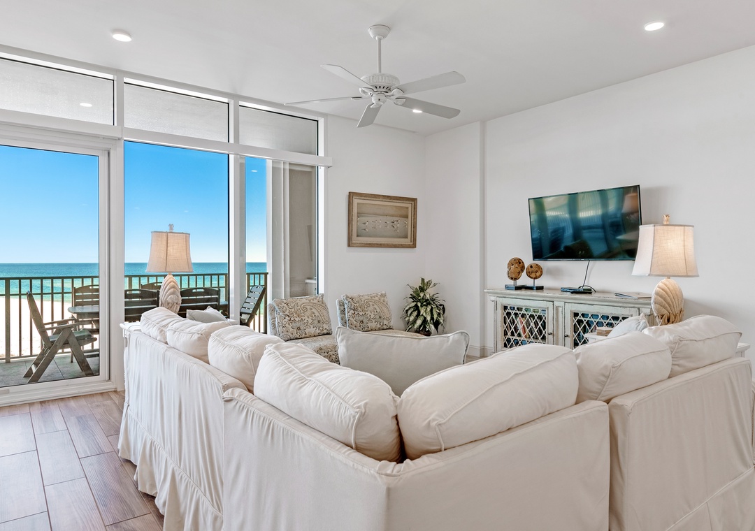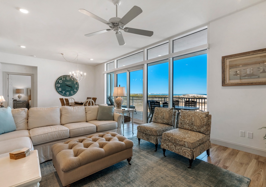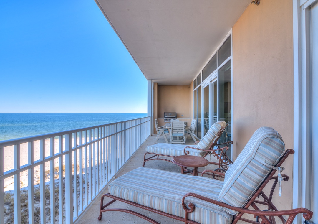Perhaps the most impressive feature, the beachfront balcony overlooking the Gulf of Mexico and the Gulf Islands National Seashore is where you’ll likely spend most of your time! Featuring ample seating including 2 cushioned chaise loungers and an outdoor table with seating for 6, an outdoor kitchen with private gas grill and a picturesque backdrop, you can pop open a bottle of your favorite wine, grill up the day's fresh catch and savor a delightful dinner while the sun sets and the moon begins to glisten over the Gulf of Mexico.