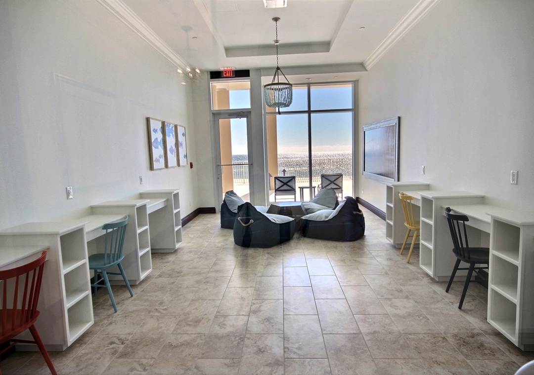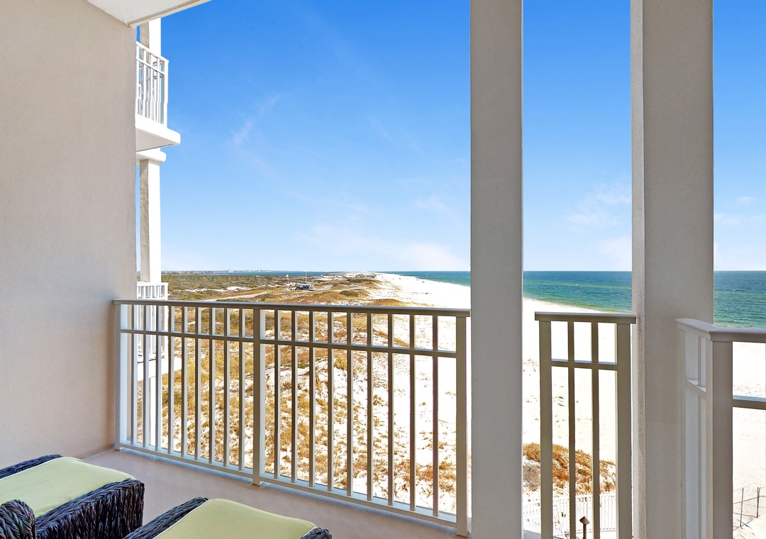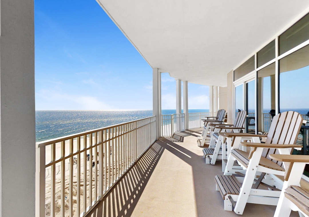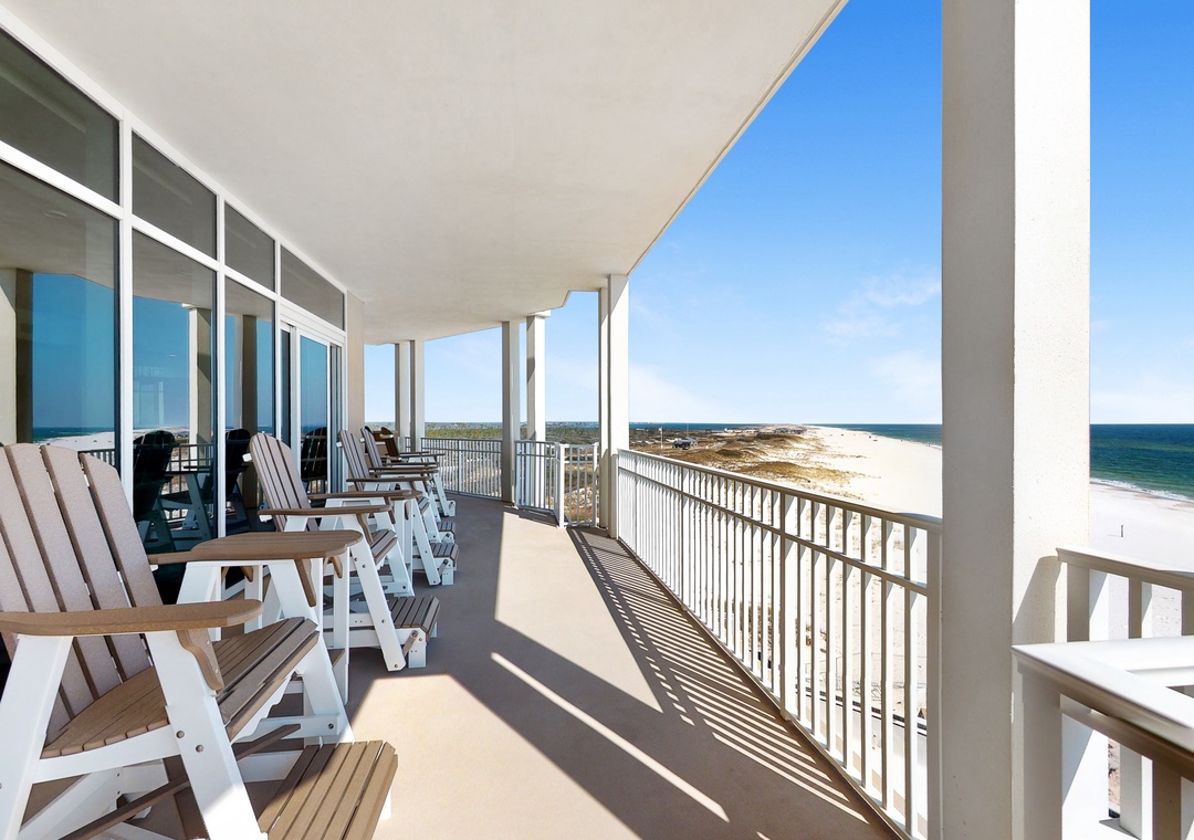 The living area flows seamlessly onto the panoramic balcony, which is elegantly furnished with high-seated rockers, swivel chairs, and side tables—an inviting setting for sunrise coffee, afternoon lounging, or sunset cocktails overlooking the Gulf. Three bedrooms feature king beds, the fourth bedroom offers two queen beds, and the fifth bedroom includes a full-over-full bunk with a twin trundle. An additional twin daybed with a twin trundle provides a flexible and comfortable sleeping option for younger guests or visiting grandchildren.