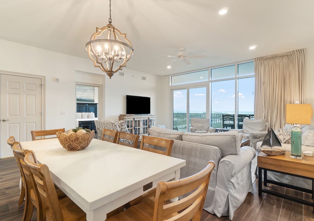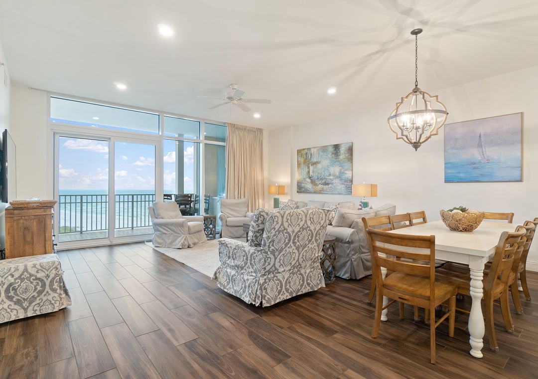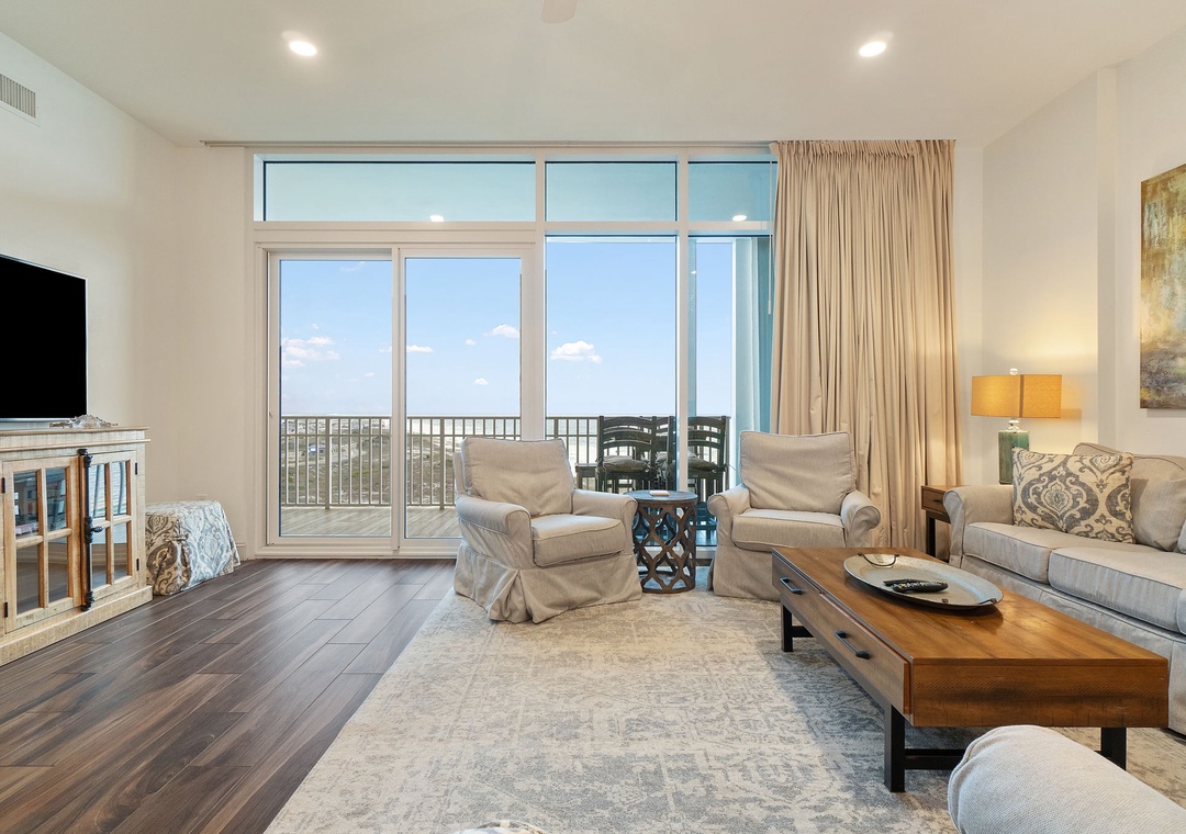 The living room affords plenty of seating, with a sofa and loveseat, along with 3 cushioned arm chairs situated in front of a large state of the art flat screen HDTV. Natural light pours in from the floor-to-ceiling sliding glass doors that open up to your expansive beachfront balcony, hosting tons of space for everyone to hang out and relax including a dining table with seating for 4, two captain chairs and two chaise loungers! The kitchen is fully stocked with all the cookware, dishware, utensils, large and small appliances needed to prepare a culinary masterpiece!