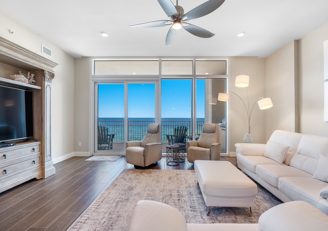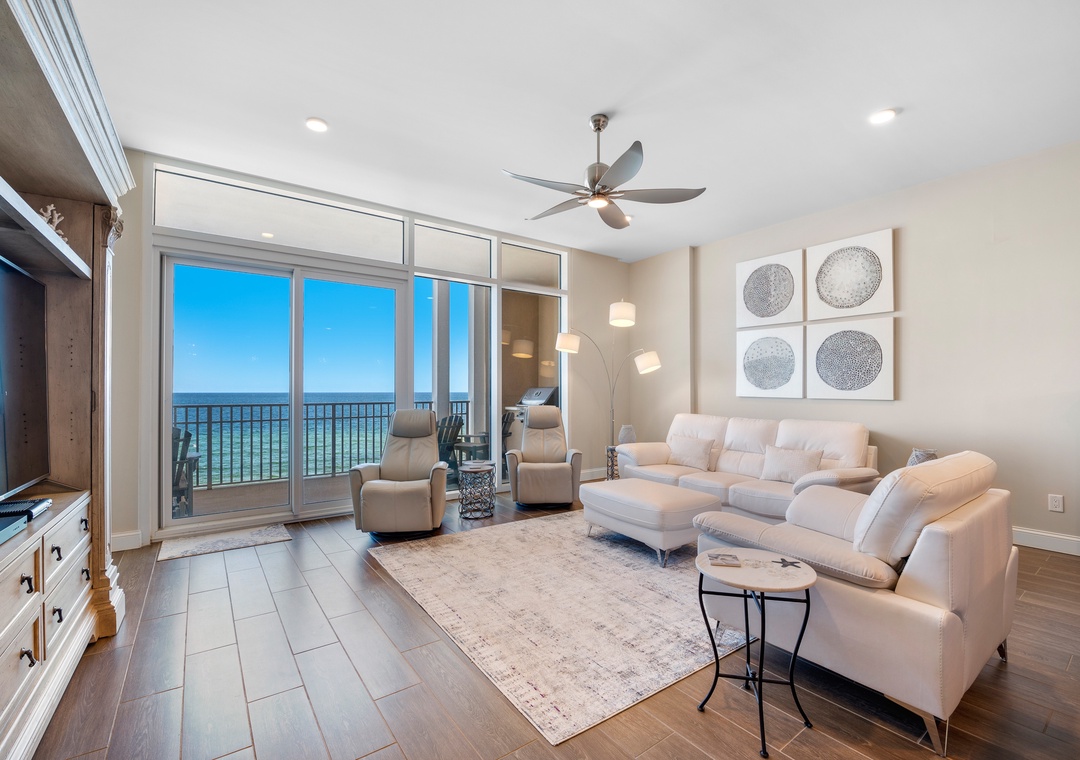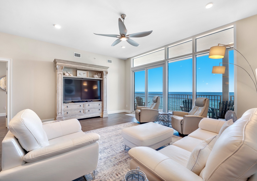 Adorned in contemporary elegance and comfort, this professionally decorated 3 bedroom, 3 bath unit features a spa-like ambiance ideal for a relaxing and rejuvenating beach retreat. The living room boasts leather furnishings with two swivel rocker recliners for ultimate relaxation in front of a large state of the art 72" flat screen HDTV. Natural light pours in from the floor-to-ceiling sliding glass doors that open up to your expansive beachfront balcony, hosting plenty of space for everyone to hang out and relax. With an outdoor dining table and 4 Breezesta gliders, plus an outdoor kitchen with gas grill, you can unwind with friends and family while enjoying a delightful dinner al fresco while the tranquil shoreline of the gulf soothes you into a state of complete serenity! The Vista Del Mar amenities include indoor and outdoor pools, a children's playroom, 2 massage rooms, large indoor and outdoor sitting areas overlooking the pool, and a state of the art exercise gym.