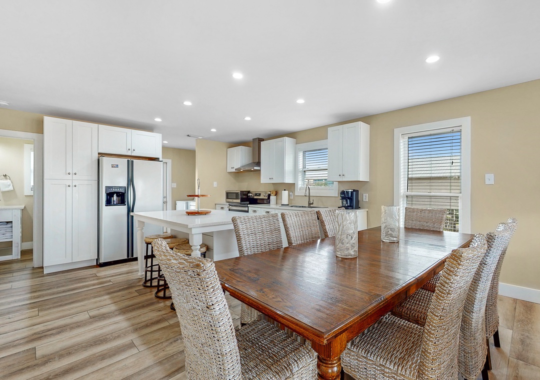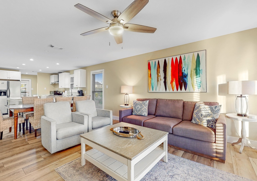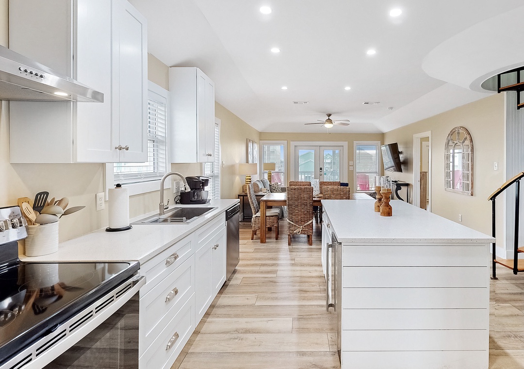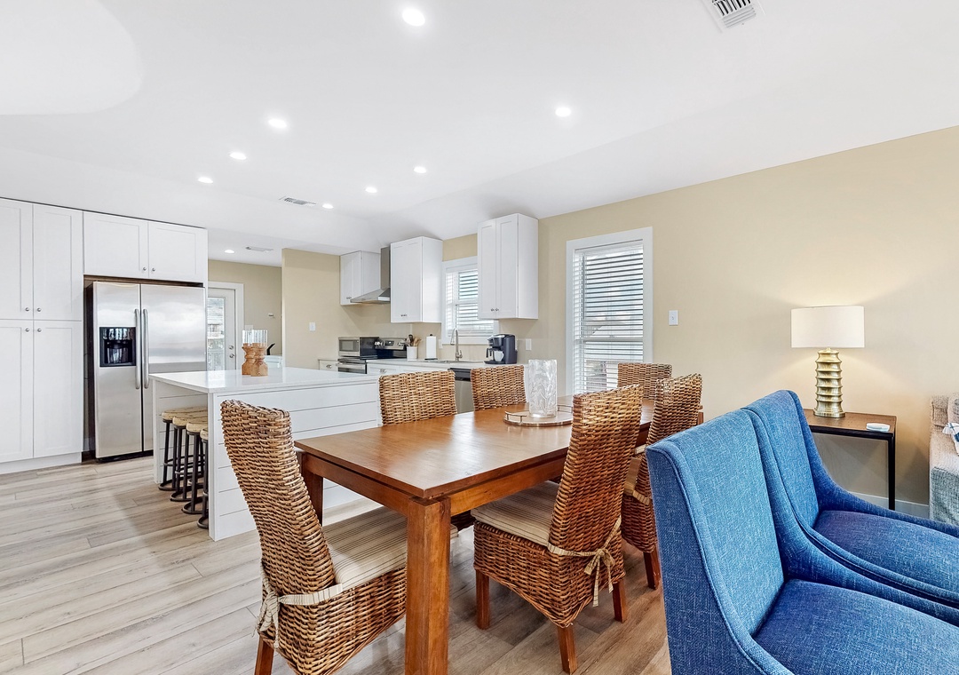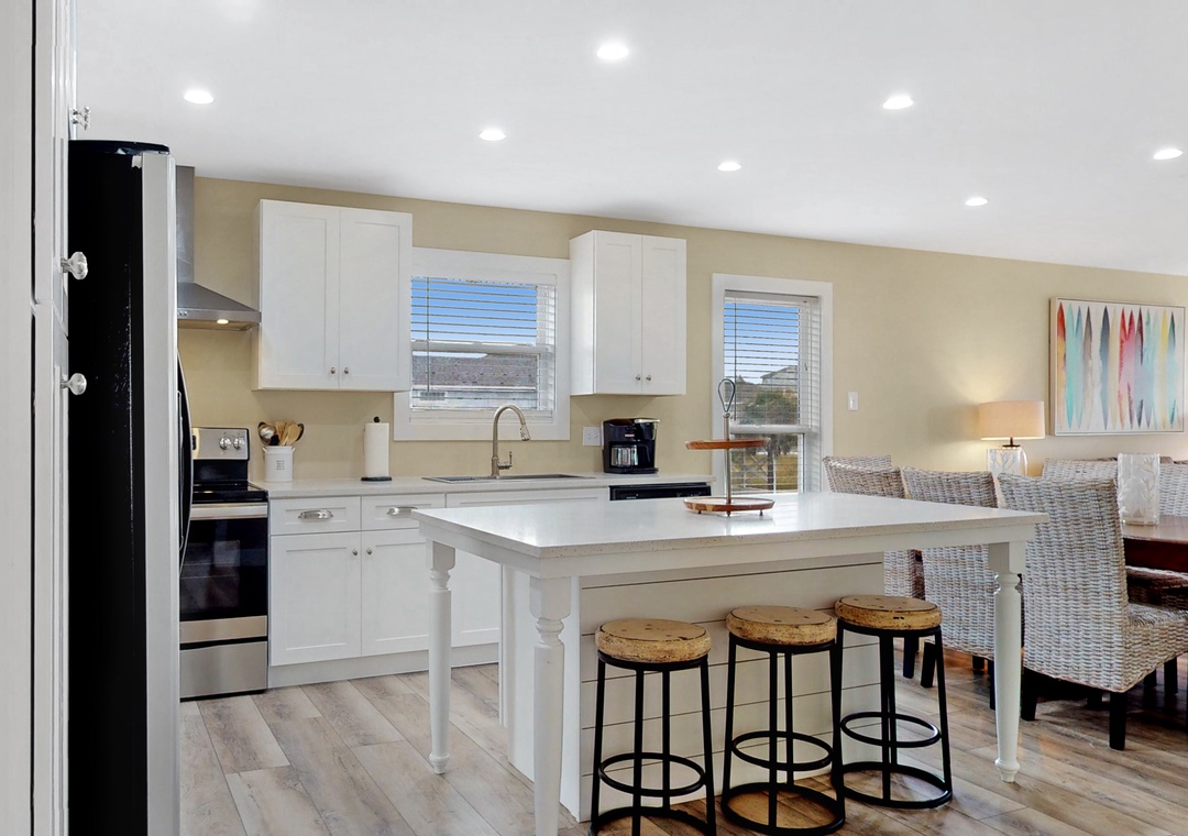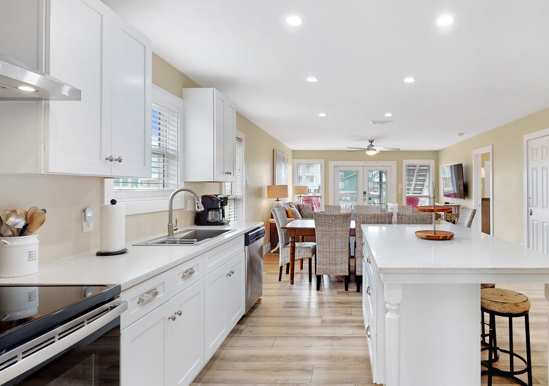 When Pigs Fly can be reserved as one large home sleeping up to sixteen guests or as two separate units—one upstairs and one downstairs, ideal for families or groups traveling together. Each level includes one king bedroom, two queen bedrooms, and a queen sleeper sofa, providing plenty of comfortable sleeping arrangements for everyone. The kitchens are fully equipped and well-stocked for everything from morning coffee to seafood dinners, and each level features inviting living and dining spaces designed for relaxing after a day of coastal fun.