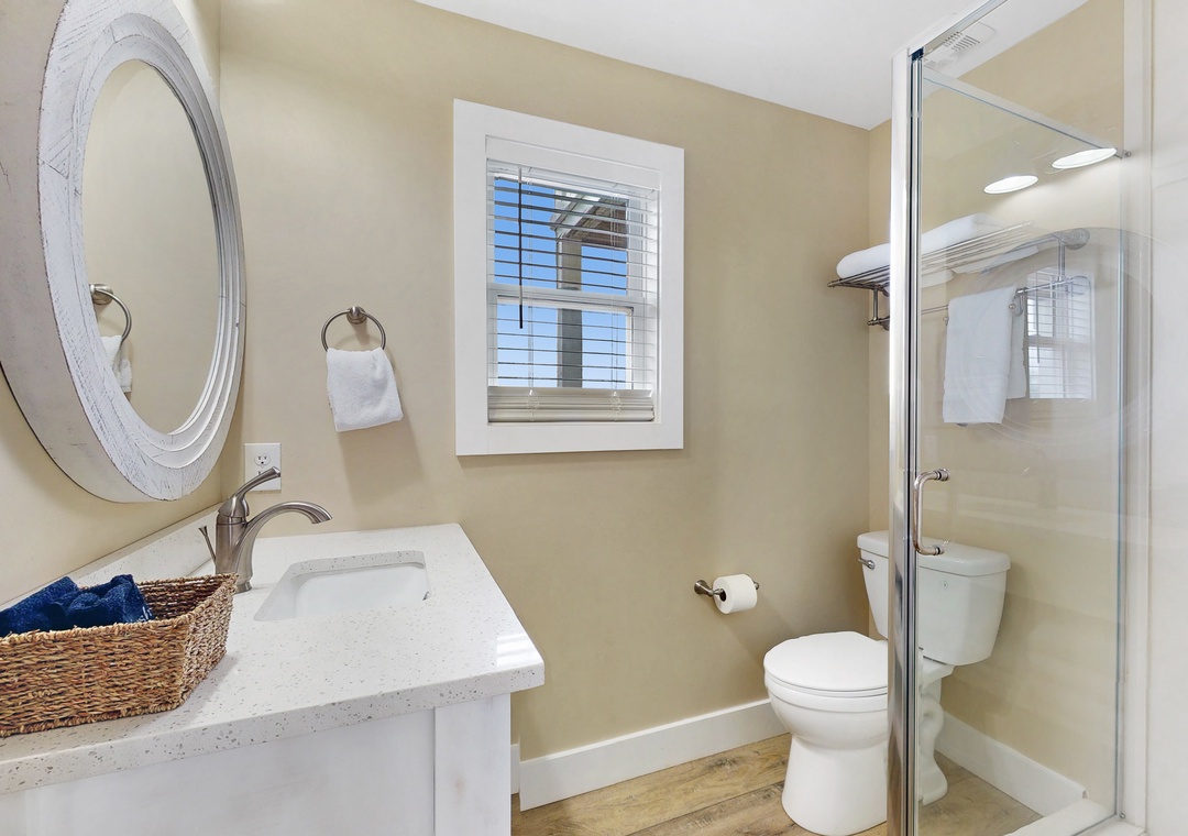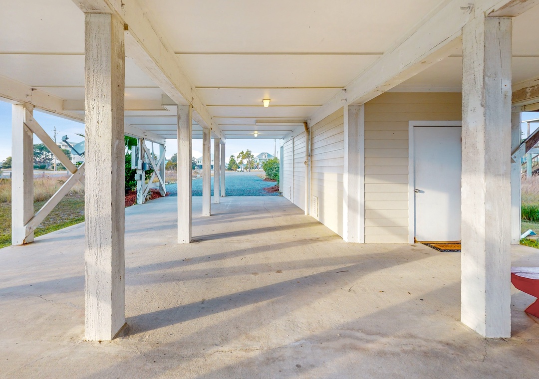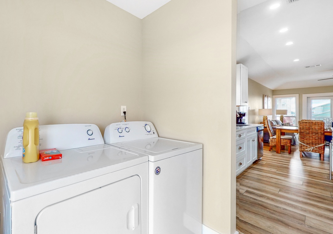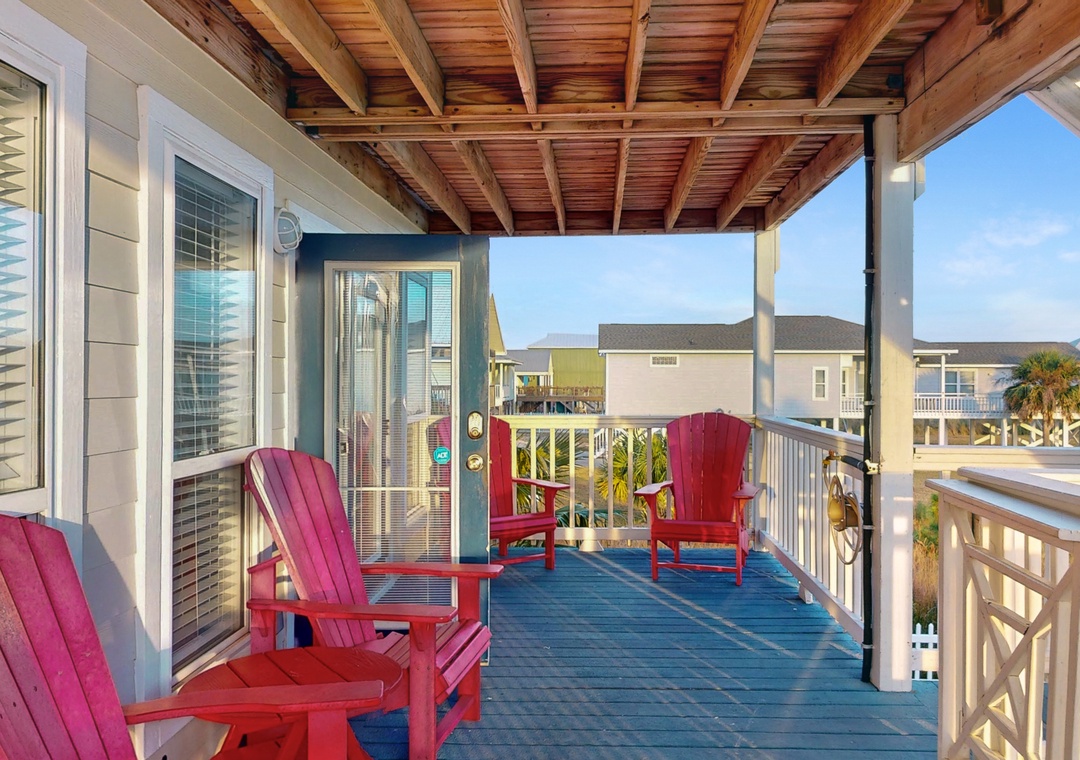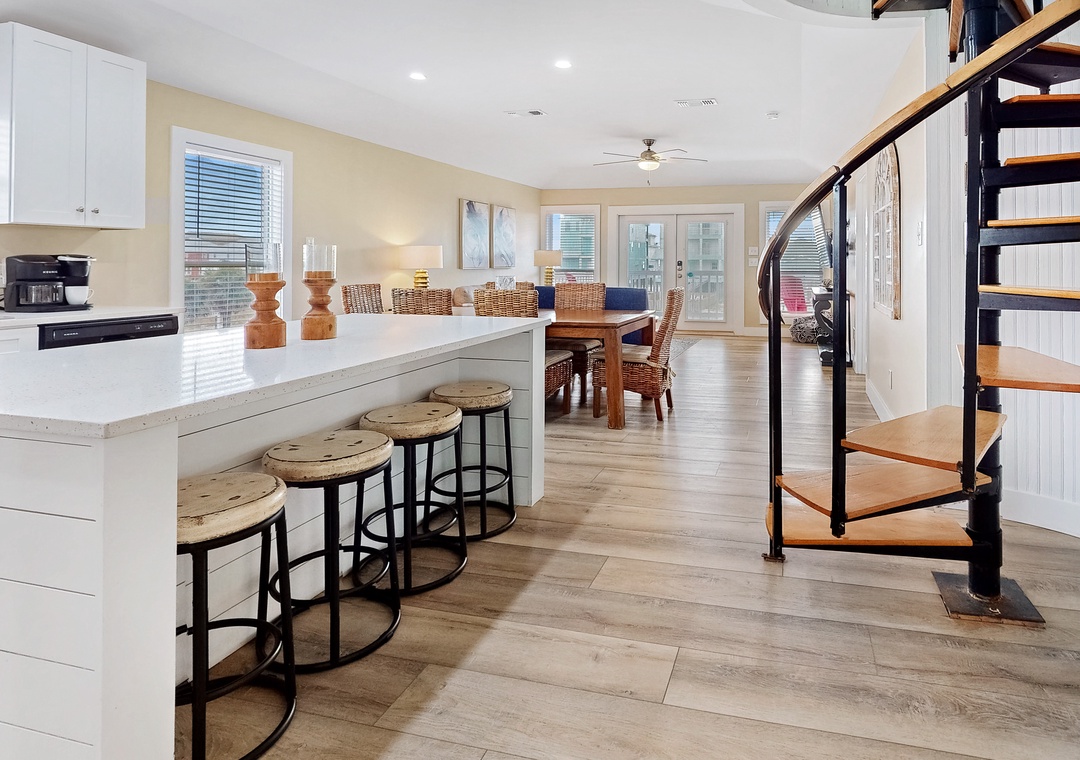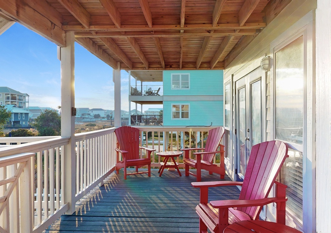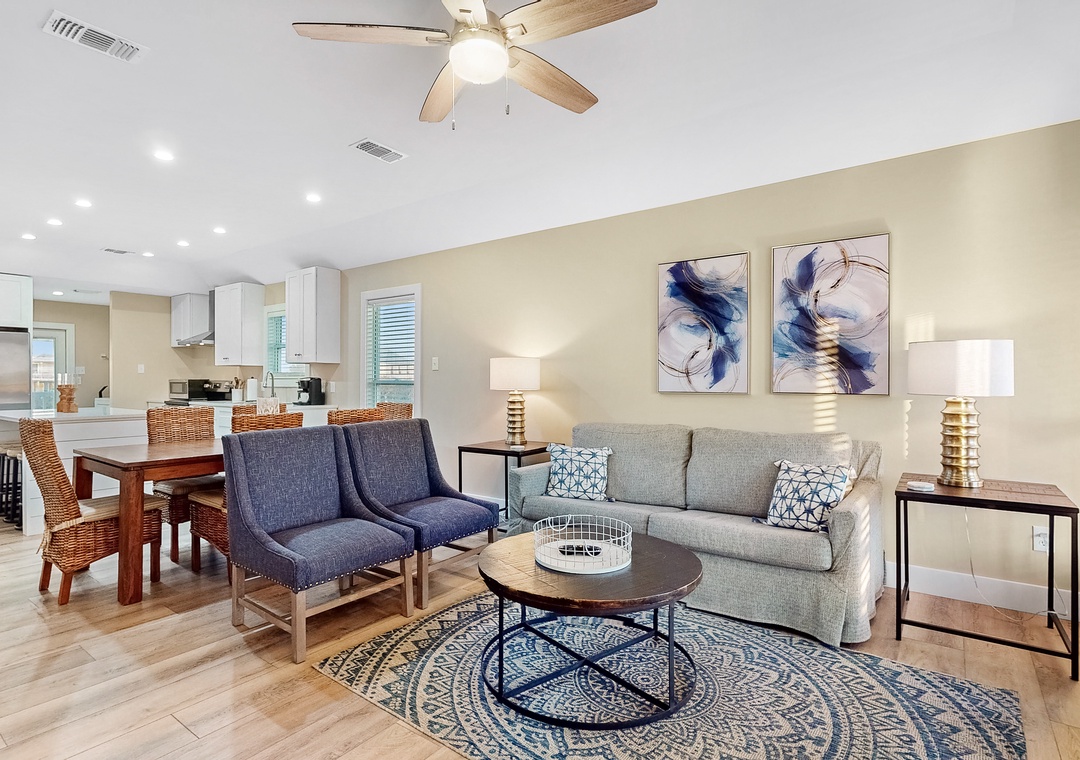 When Pigs Fly can be reserved as one large home sleeping up to sixteen guests or as two separate units—one upstairs and one downstairs, ideal for families or groups traveling together. Each level includes one king bedroom, two queen bedrooms, and a queen sleeper sofa, providing plenty of comfortable sleeping arrangements for everyone. The kitchens are fully equipped and well-stocked for everything from morning coffee to seafood dinners, and each level features inviting living and dining spaces designed for relaxing after a day of coastal fun.