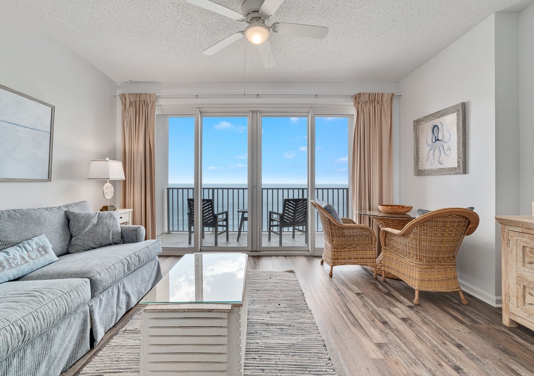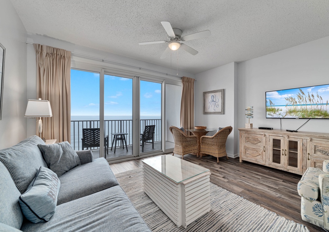 This spacious 12th floor unit is adorned in a beach-chic decor, with shades of navy, cool grays and calming neutrals paired with natural finishes creating a tranquil atmosphere ideal for a relaxing beach retreat. Gather the group for movie night in the spacious living area, boasting a large flat screen TV, plush sofa, beautiful printed cushioned chair, and beachfront balcony access! Step onto your expansive covered terrace and gaze out into the limitless horizon, where the soft quartz sands and emerald turquoise waters of the Gulf of Mexico stretch into an endless horizon. Enjoy your morning coffee while the sun rises over the Gulf, or share a bottle of wine with loved ones while the moon's reflection glistens over the water, and the hypnotic sound of the waves relaxes your mind and soothes your soul!