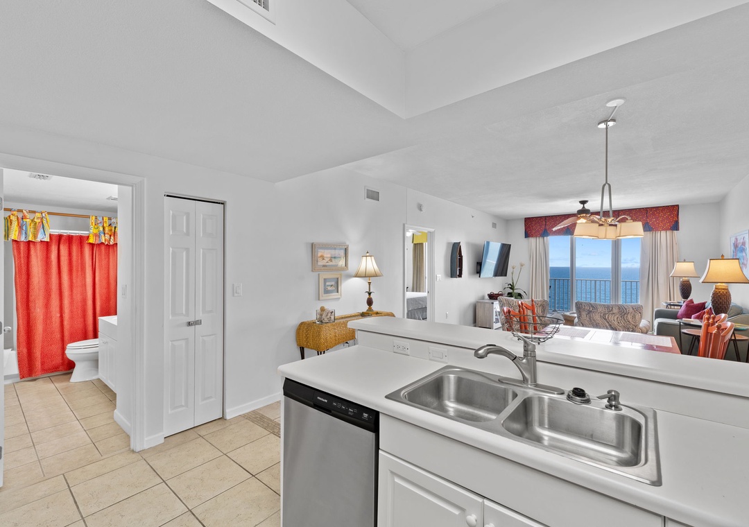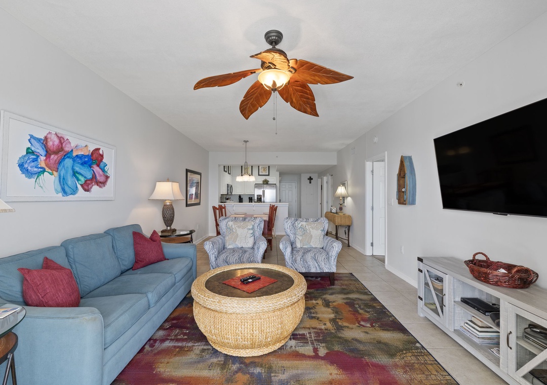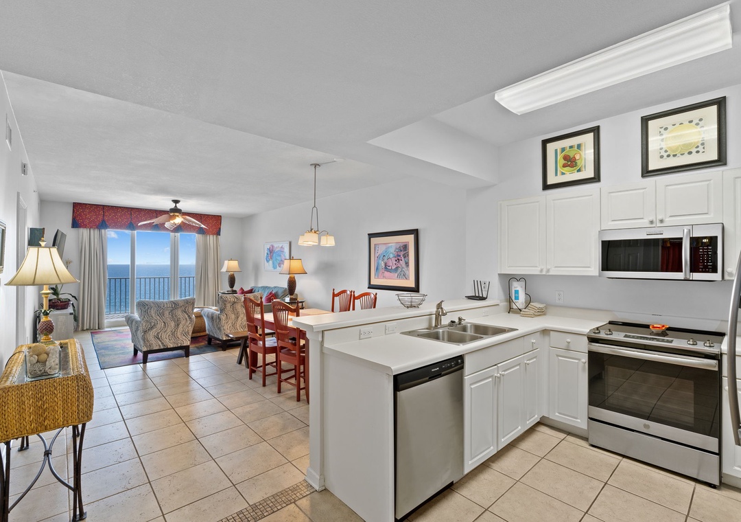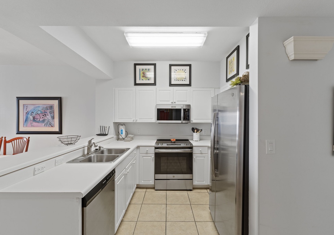 Inside, you’ll find a bright and breezy layout with all the comforts of home. The living room is perfect for cozy movie nights or quiet sunset watching, while the modern kitchen is stocked with stainless steel appliances and everything you need for homemade meals.