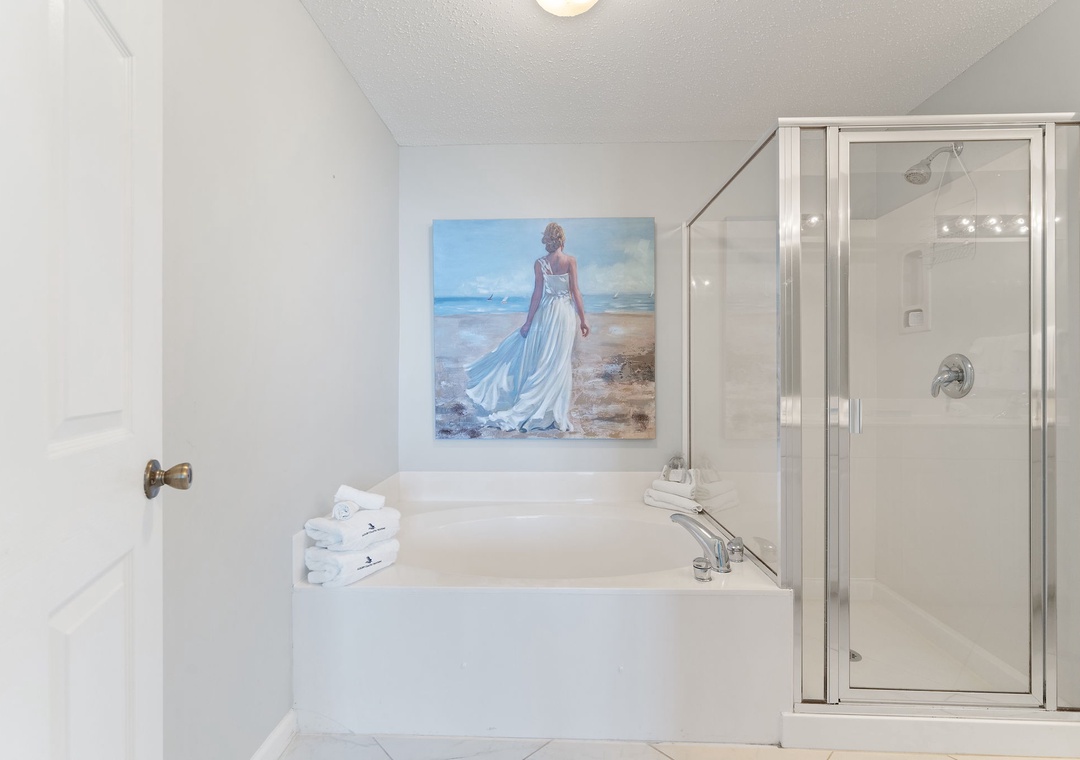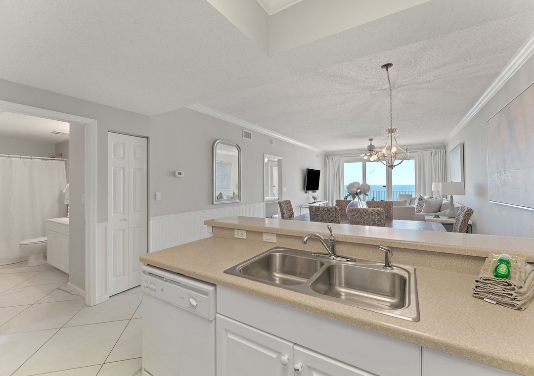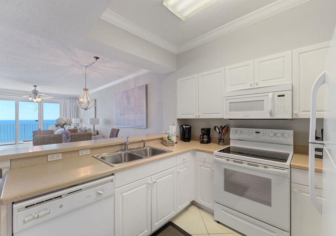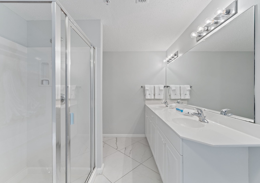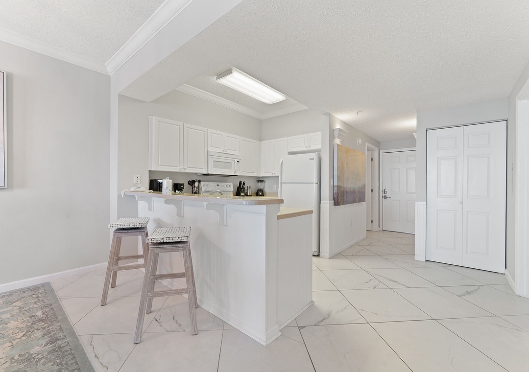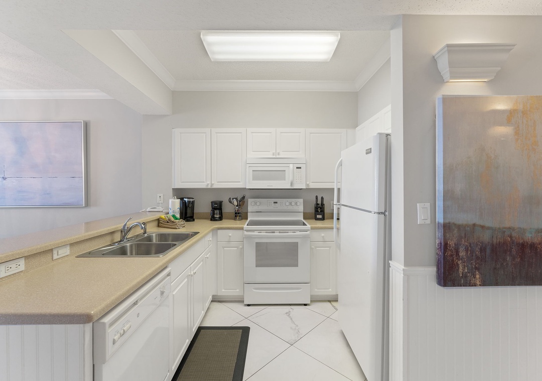 The kitchen is equipped with everything necessary to create the perfect meal, including all the full-sized appliances, small appliances and utensils needed to cook a gourmet meal. The impressive master suite boasts a King bed with luxurious linens and a premium mattress, and an attached bathroom. You’ll definitely indulge in some much-needed relaxation in this master retreat! The second bedroom is elegantly appointed with King and luxury bedding. There is also a twin bunk room, perfect for kids! This luxury unit also features a full-size washer and dryer.