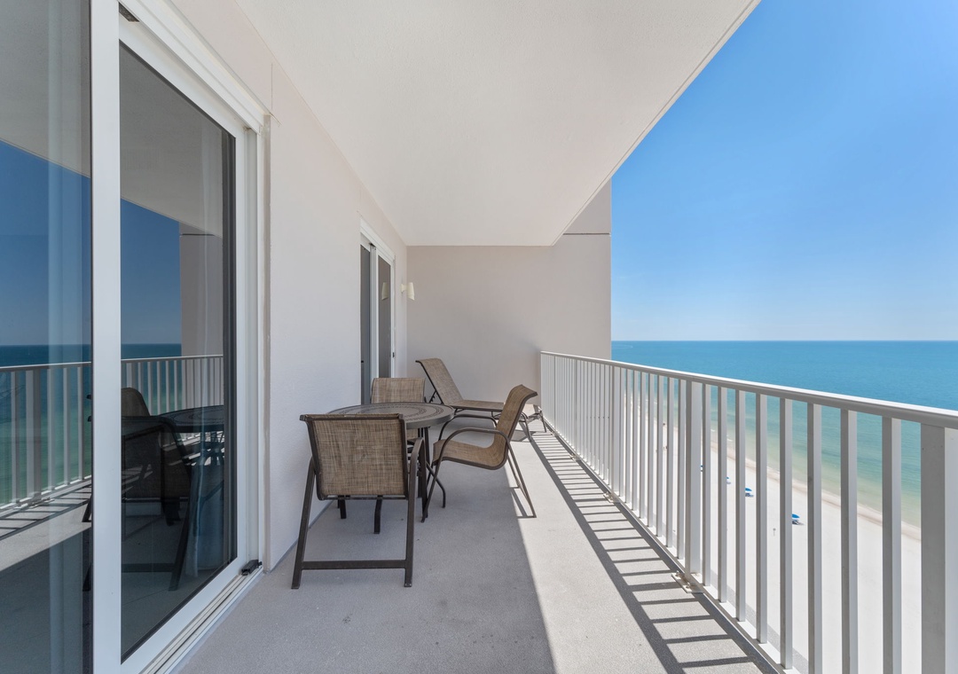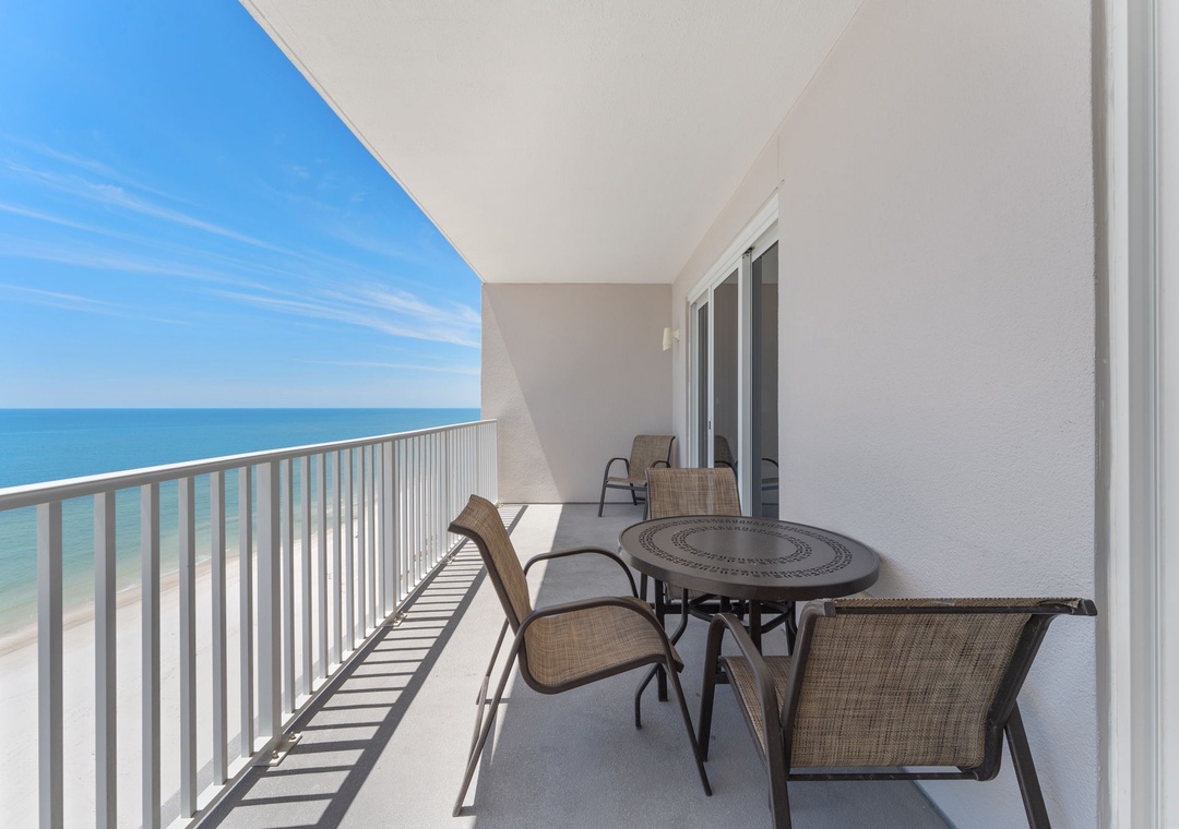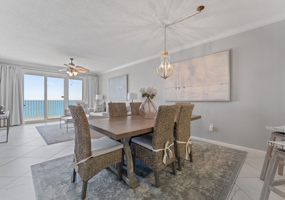 Floor-to-ceiling sliding glass doors open to the expansive covered terrace, and with comfortable furniture for the whole group to enjoy their favorite beverage and even savor a delicious meal while delighting in panoramic vistas of the sparkling Gulf Coast.