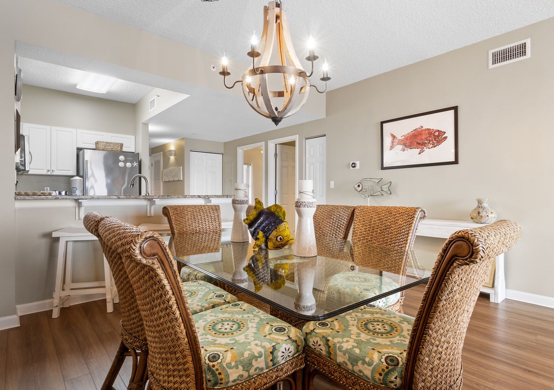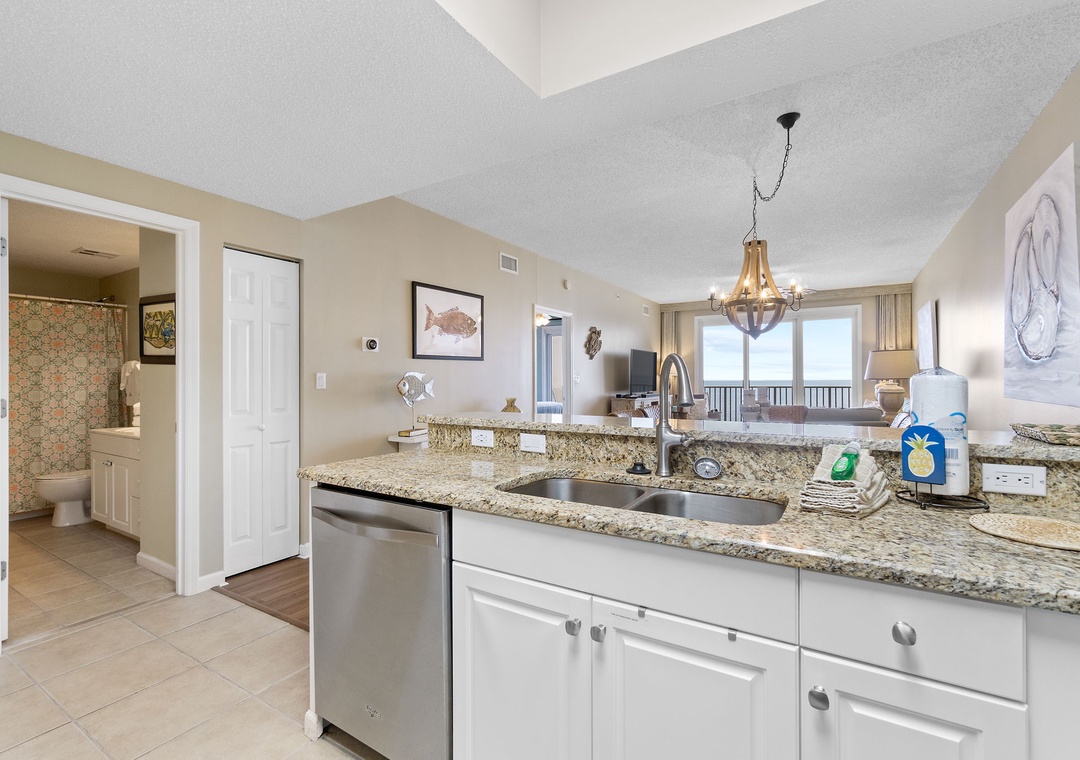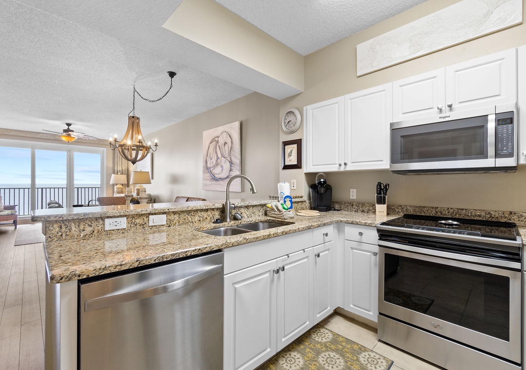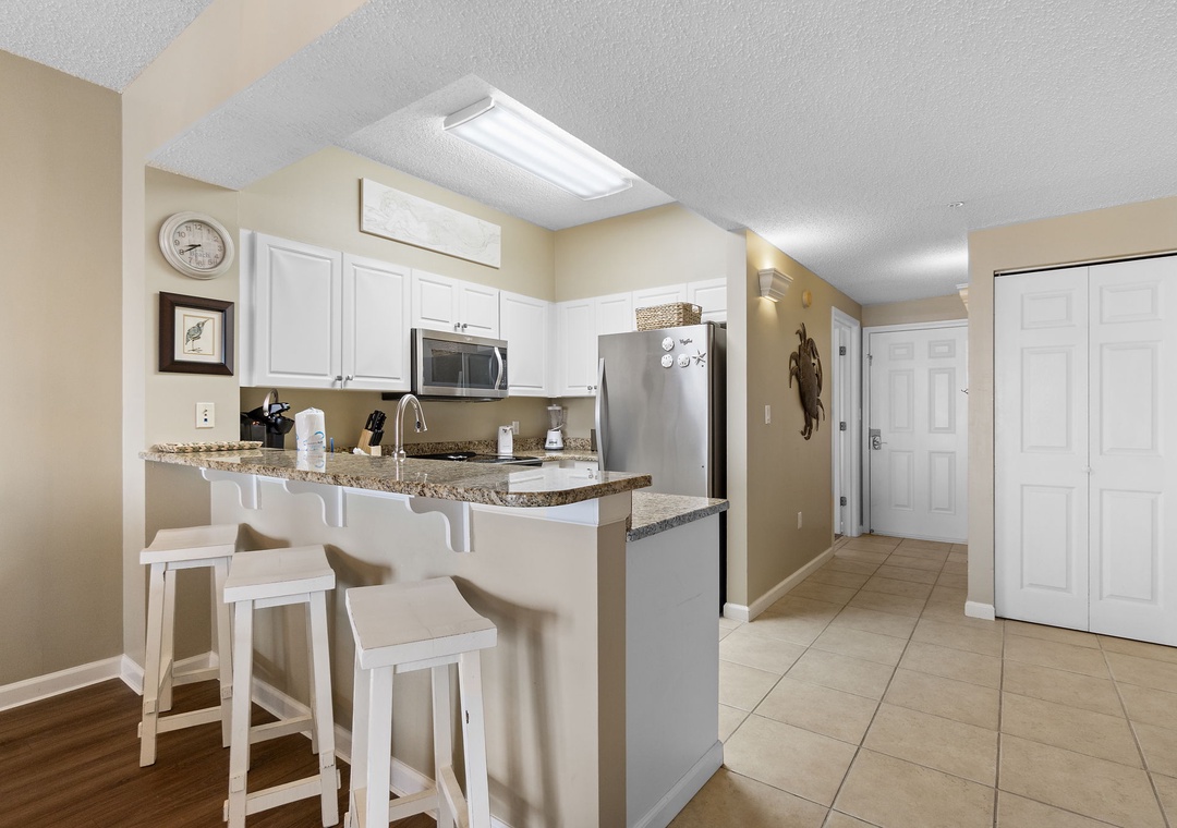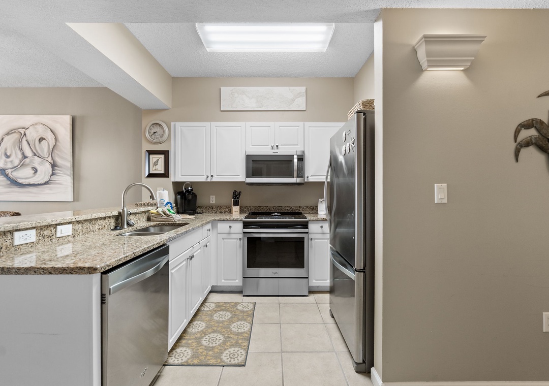 The heart of this vacation haven is the fully equipped kitchen, where culinary delights await. The kitchen features granite countertops, sleek stainless steel appliances, and contemporary cabinetry, making meal preparation a breeze. Whether you're whipping up a quick breakfast before hitting the beach or indulging in a gourmet dinner, you'll find everything you need right at your fingertips.