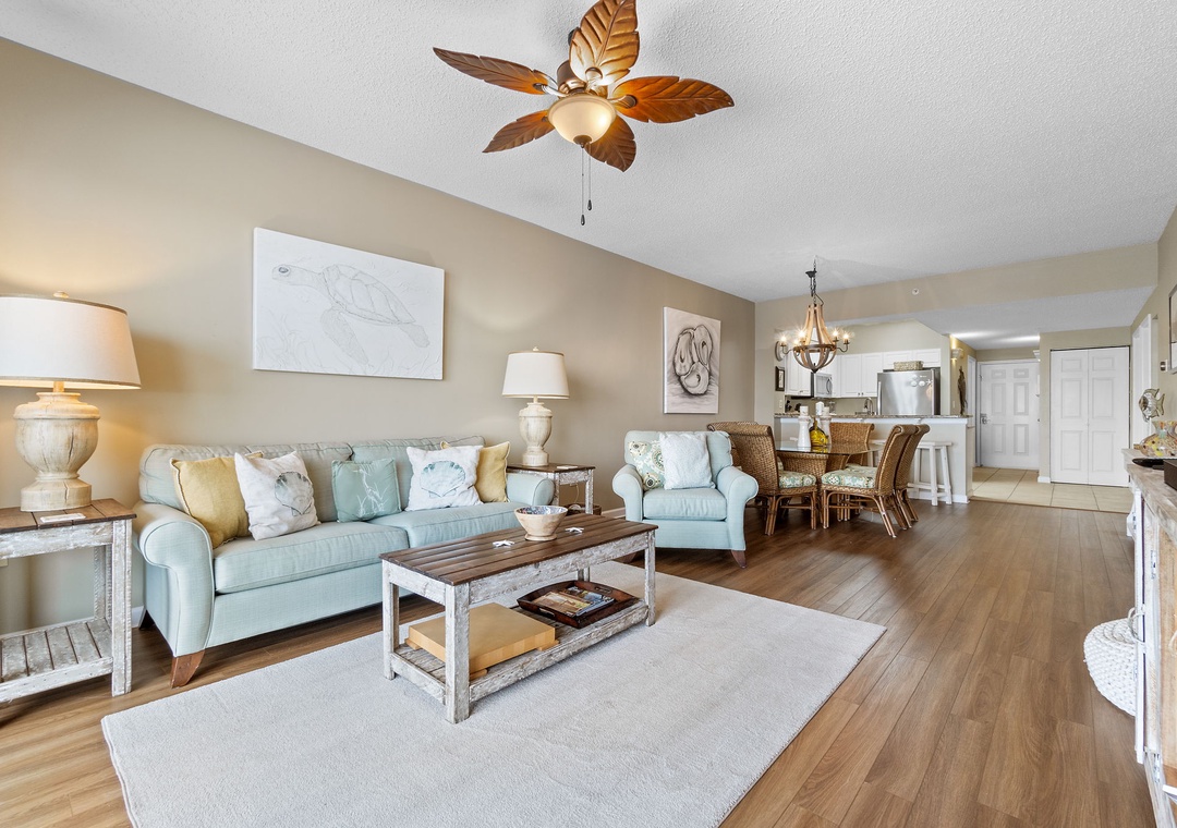 The living area is an inviting space where you can relax and enjoy quality time with family and friends. The open floor plan seamlessly connects the living room to the kitchen and dining area, creating a welcoming atmosphere for gatherings and entertaining. The luxury vinyl flooring adds a touch of sophistication to the space while remaining easy to maintain, perfect for sandy feet.