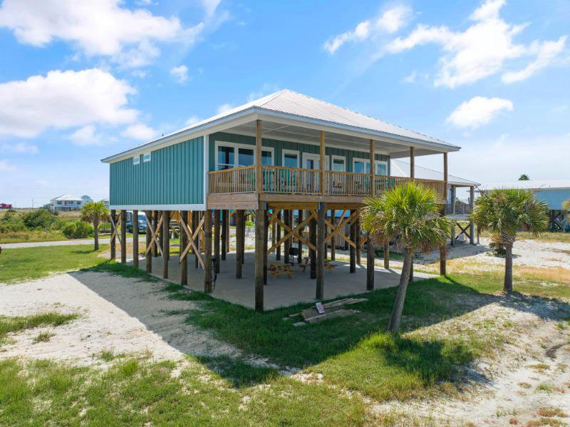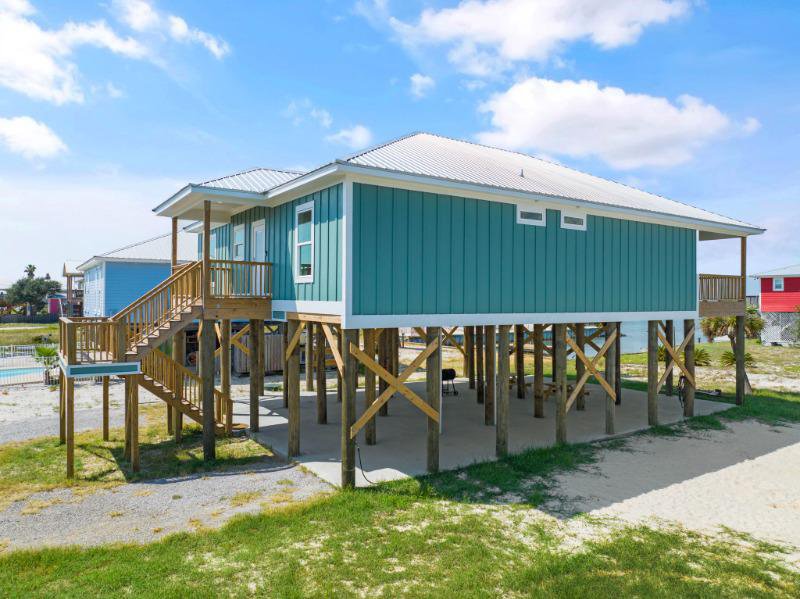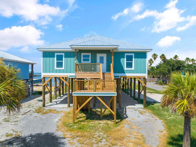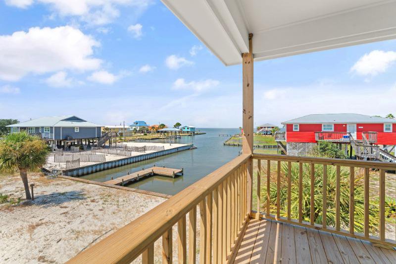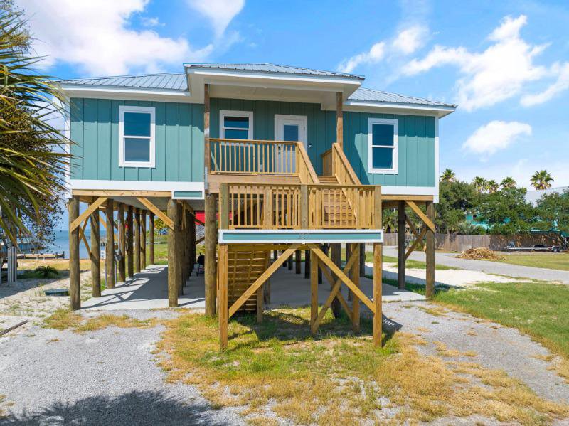 Exquisite 4-bedroom, 4-bathroom Fort Morgan retreat, featuring a modern kitchen with stainless steel appliances, quartz countertops, and an open living area. The main bedroom offers a picturesque bay view, and with one king bed and three queen beds, this property comfortably accommodates up to 8 guests.